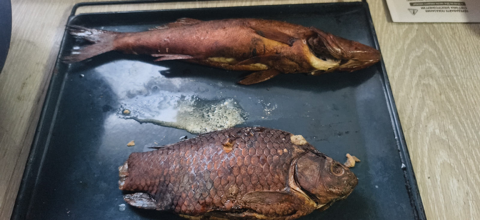 The image captures two cooked or smoked whole fish resting on a dark, rectangular metal baking tray. The fish are positioned diagonally across the tray. The upper fish is reddish-brown and elongated,…read more
