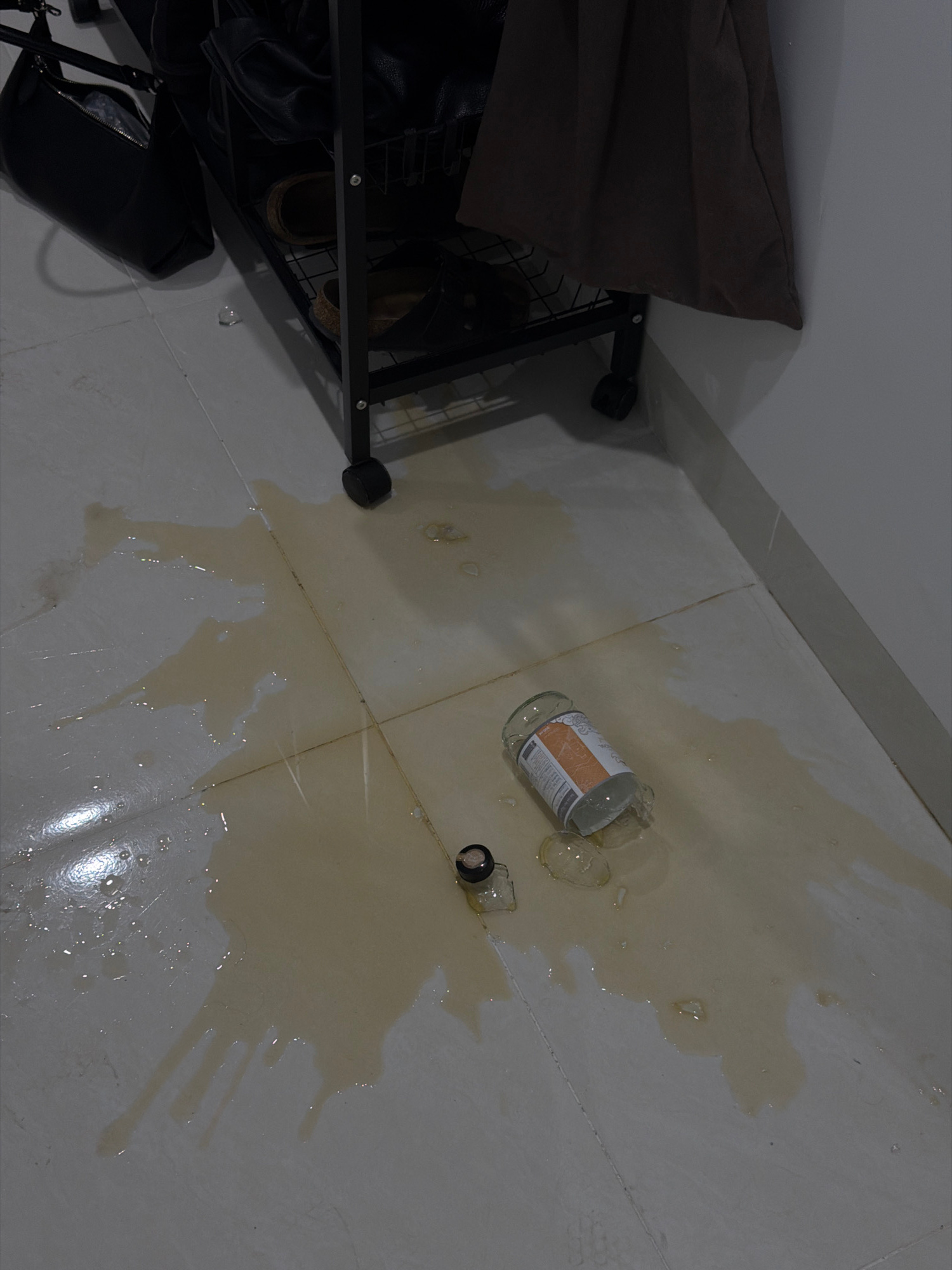 The image depicts a spilled liquid on a tiled floor next to a metal shelving unit. A broken glass bottle lies on its side within the spilled liquid. The shelving unit contains shoes and bags. The loca…read more
