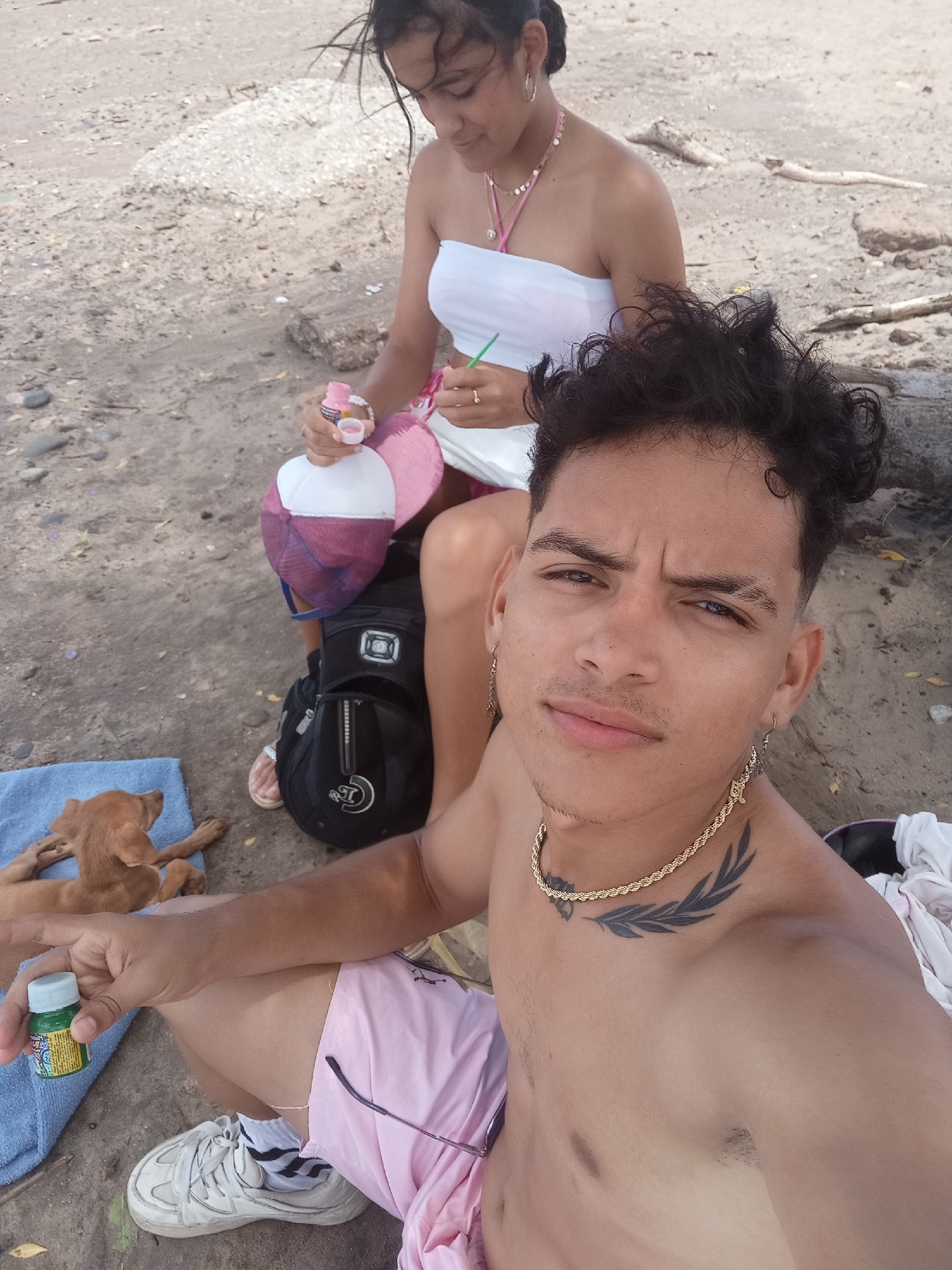The image depicts a man in Altagracia, Venezuela, possibly on a beach. He is shirtless, wearing pink shorts and white sneakers, and has a gold chain and a leaf tattoo on his chest. He is holding a sma…read more