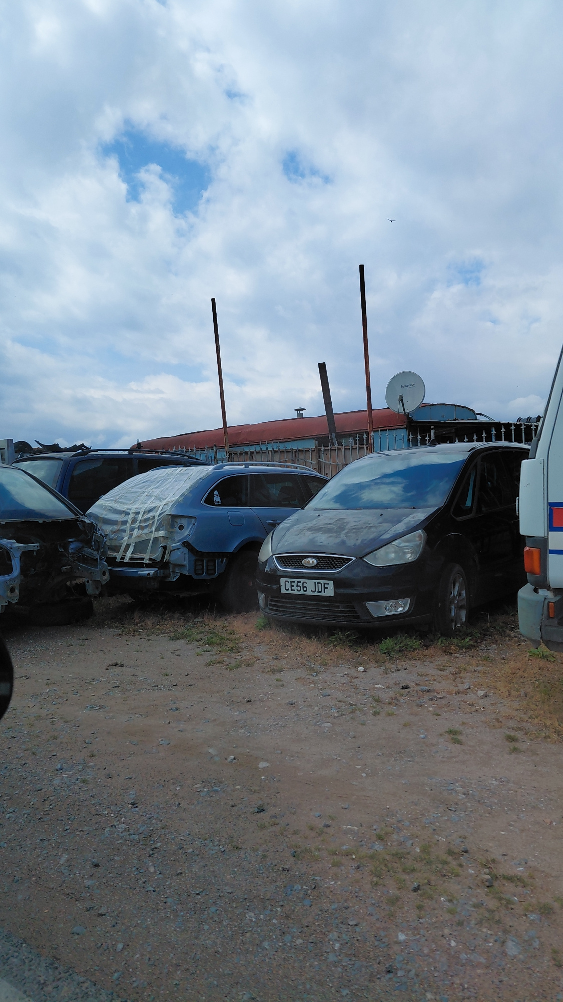 The image depicts a junkyard or vehicle dismantling facility. The foreground shows multiple partially dismantled cars, primarily blue in color. Car bodies are stripped of parts, with some covered in p…read more