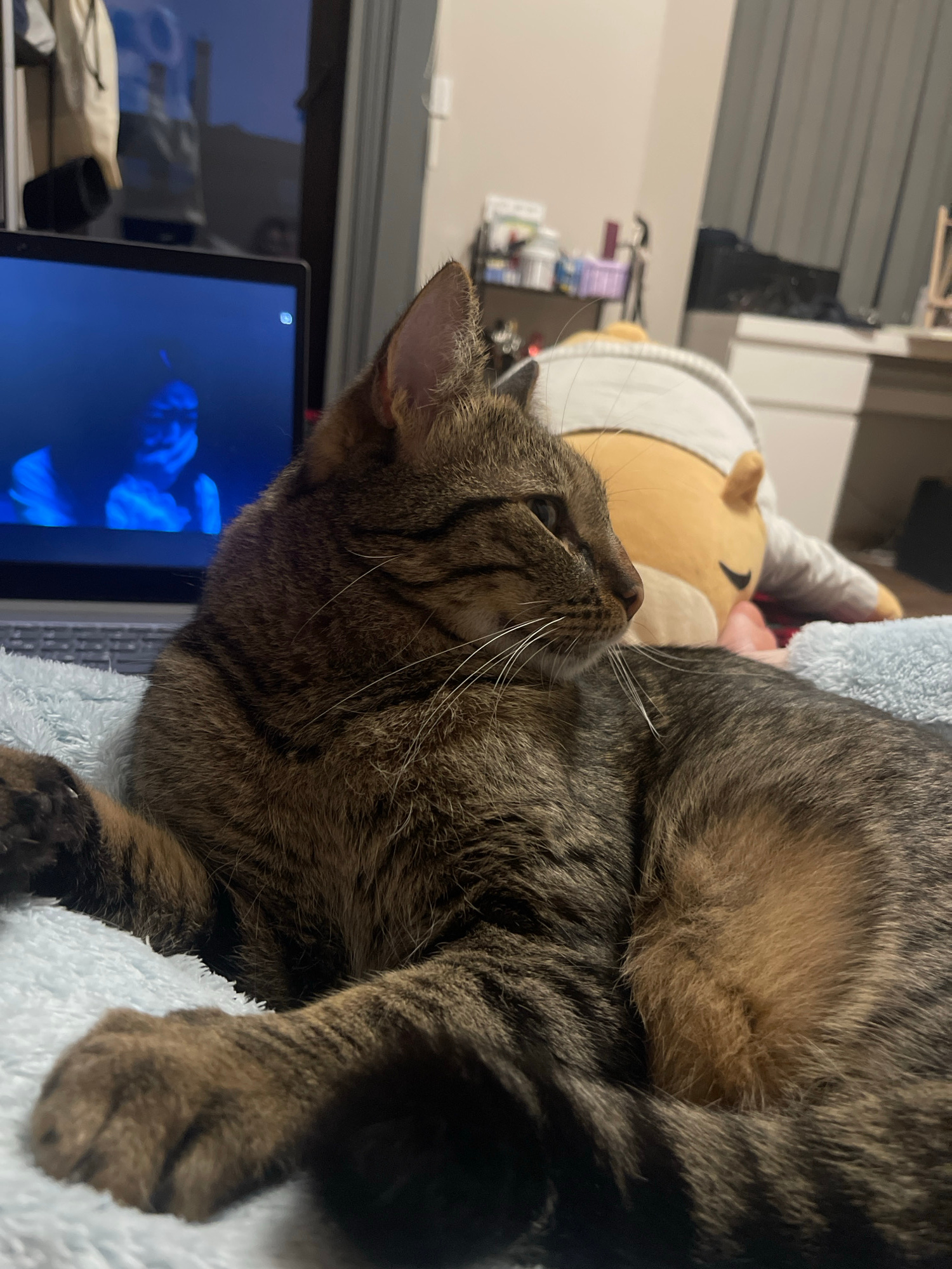 A brown tabby cat rests on a light blue, plush blanket, next to a laptop displaying a bright blue image. A stuffed animal is partially visible behind the cat. The scene takes place indoors, on a desk…read more