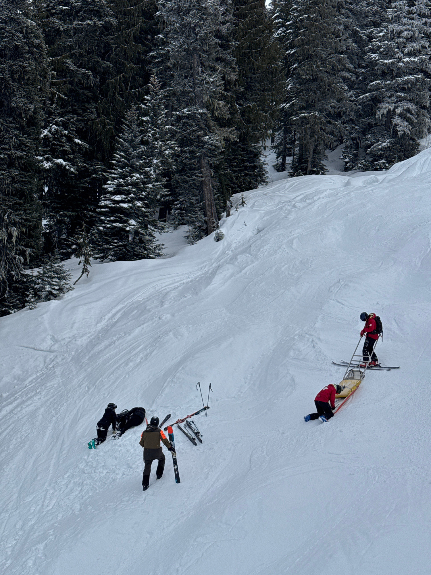 The image, taken from an aerial perspective, depicts a snowy mountainside adjacent to a dense forest, likely in Whistler, Canada, a resort municipality known for skiing and snowboarding. Three individ…read more