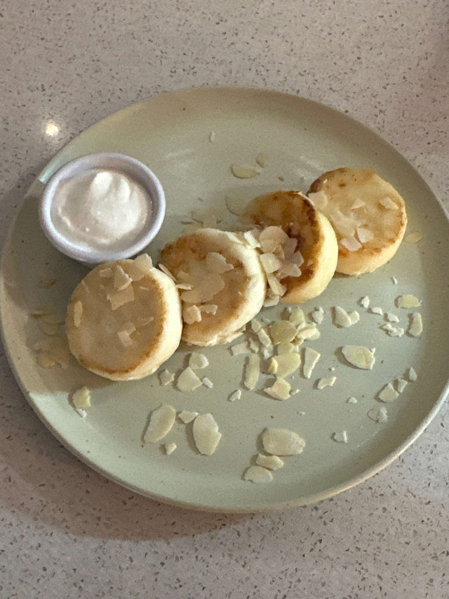 A top-down view shows a light green plate holding four cylindrical food items, possibly cheese pancakes or syrniki, arranged in a vertical stack with flaked almonds scattered on top and around them. A…read more