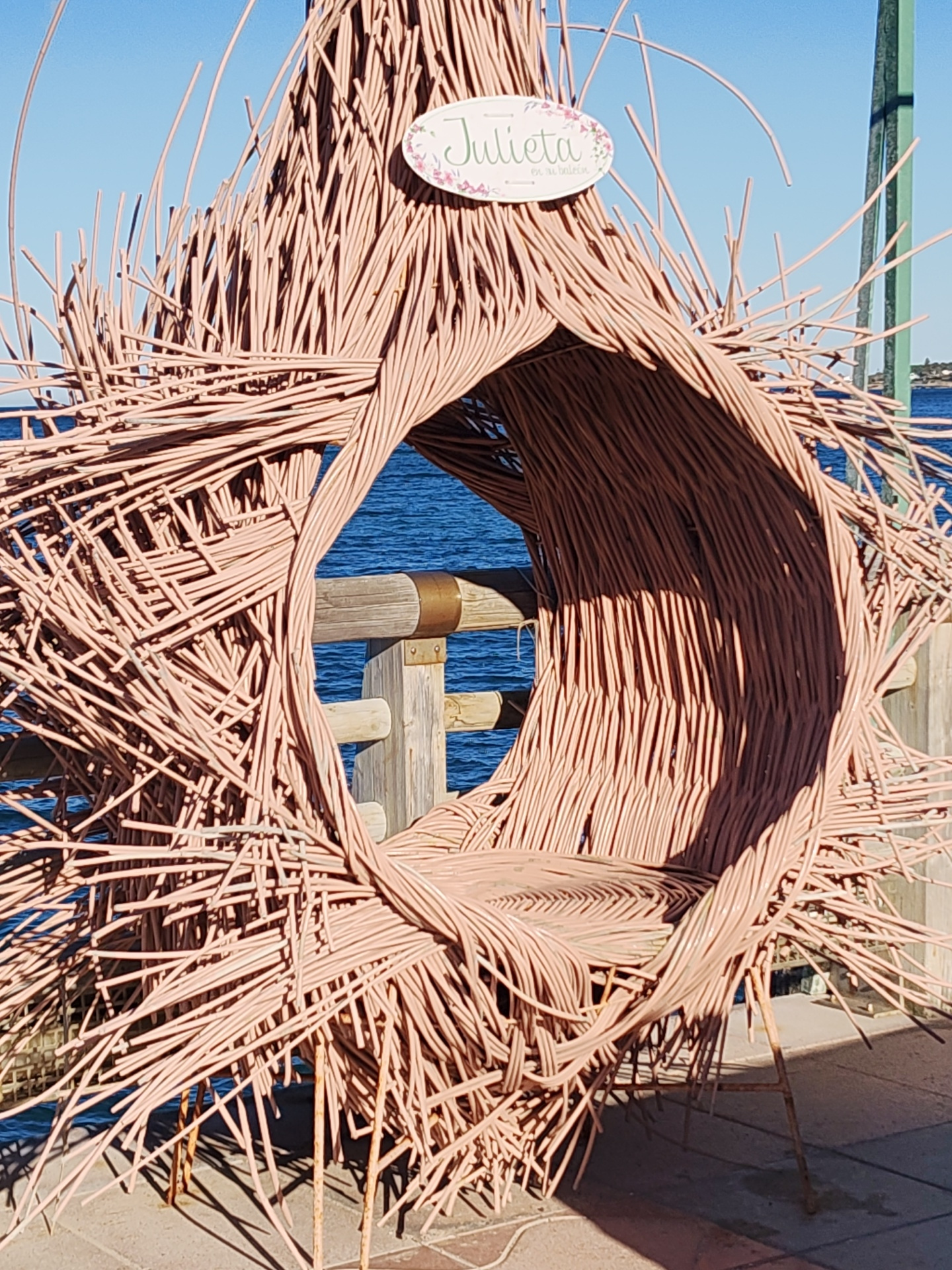 A large, artistic chair, resembling a nest or cocoon, dominates the frame. It is constructed from numerous thin, woven strands of light brown or pinkish material, possibly wicker or branches. The chai…read more