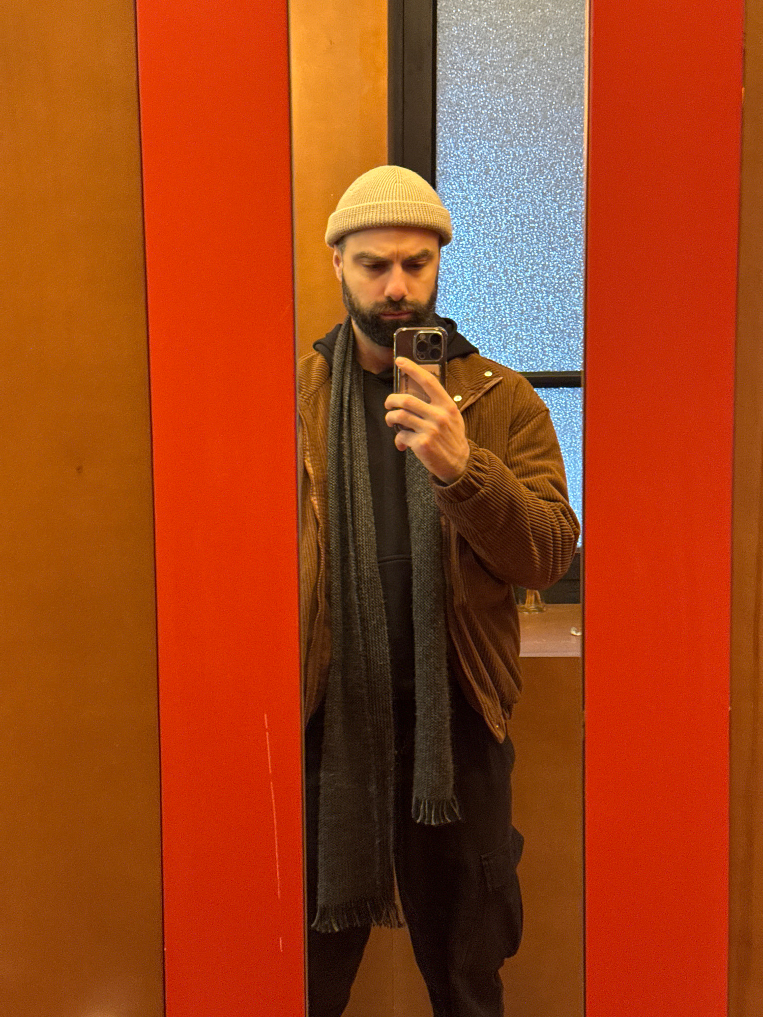 A person with a beard and wearing a tan beanie, a brown corduroy jacket, and a gray scarf is taking a selfie in front of a mirror. The mirror is framed by horizontal bands of brown and orange. Behind…read more