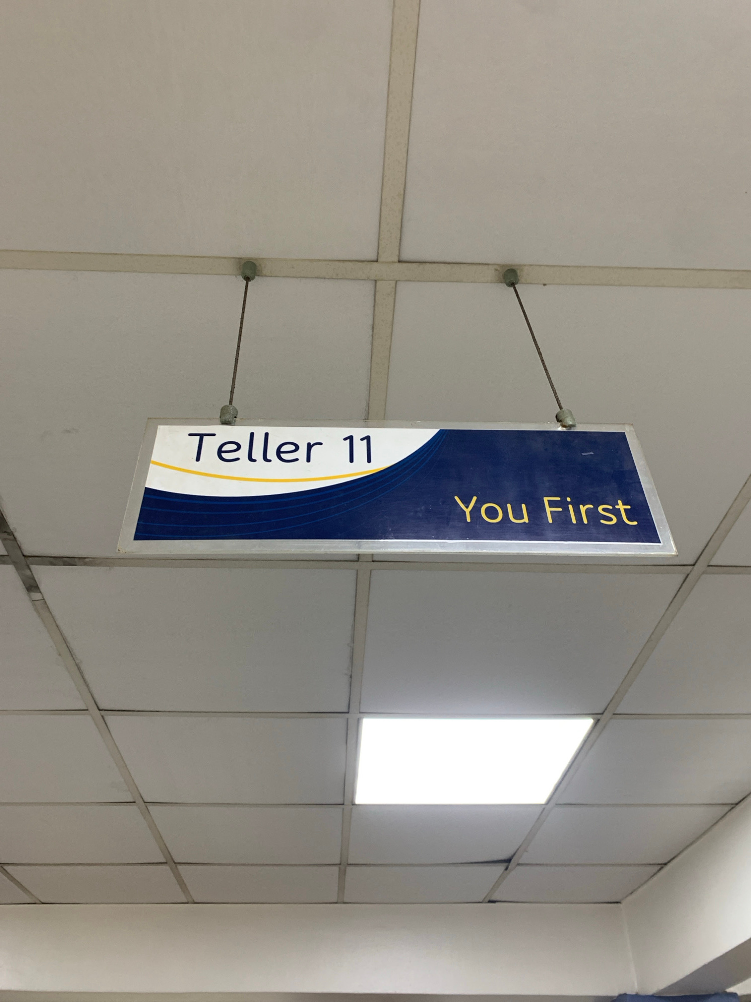 A close-up shot depicts a sign indicating "Teller 11" and "You First." The sign is vertically oriented and suspended by two thin cables from a metal grid structure against a backdrop of rectangular, w…read more
