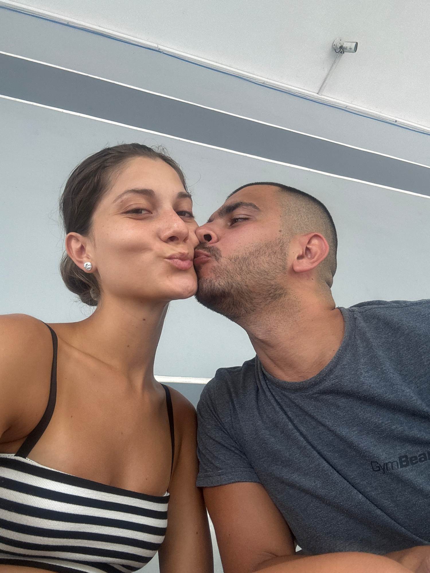 This rotated close-up image captures a tender moment between a man and a woman in an indoor setting. The man is seen kissing the woman on her cheek or near her mouth, while she faces the camera with a…read more