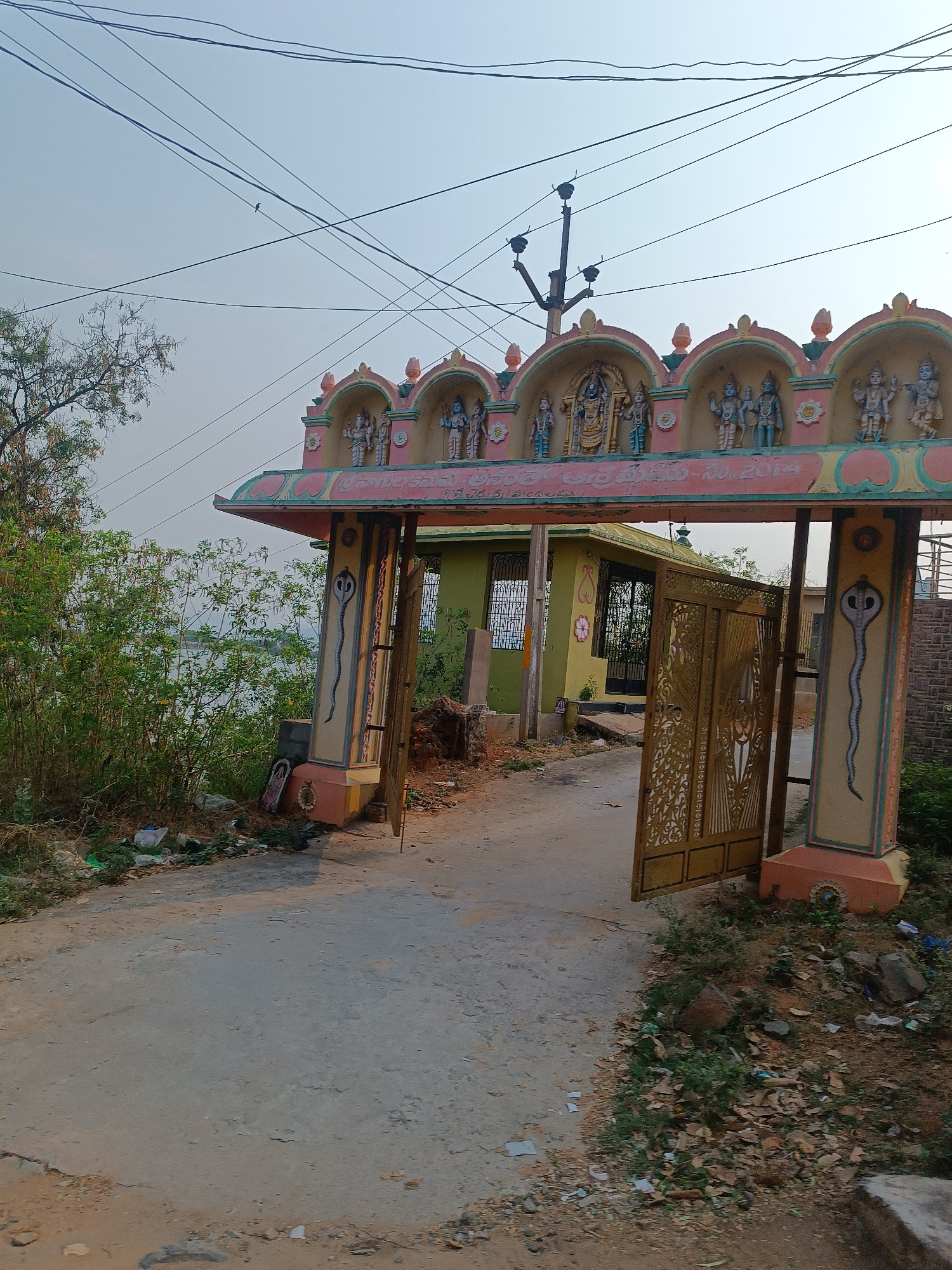 The image depicts the entrance to a temple in Kothacheruvu, India. The gate is ornate, with colorful carvings of deities along the top and snake motifs painted on the supporting pillars. The gate is p…read more