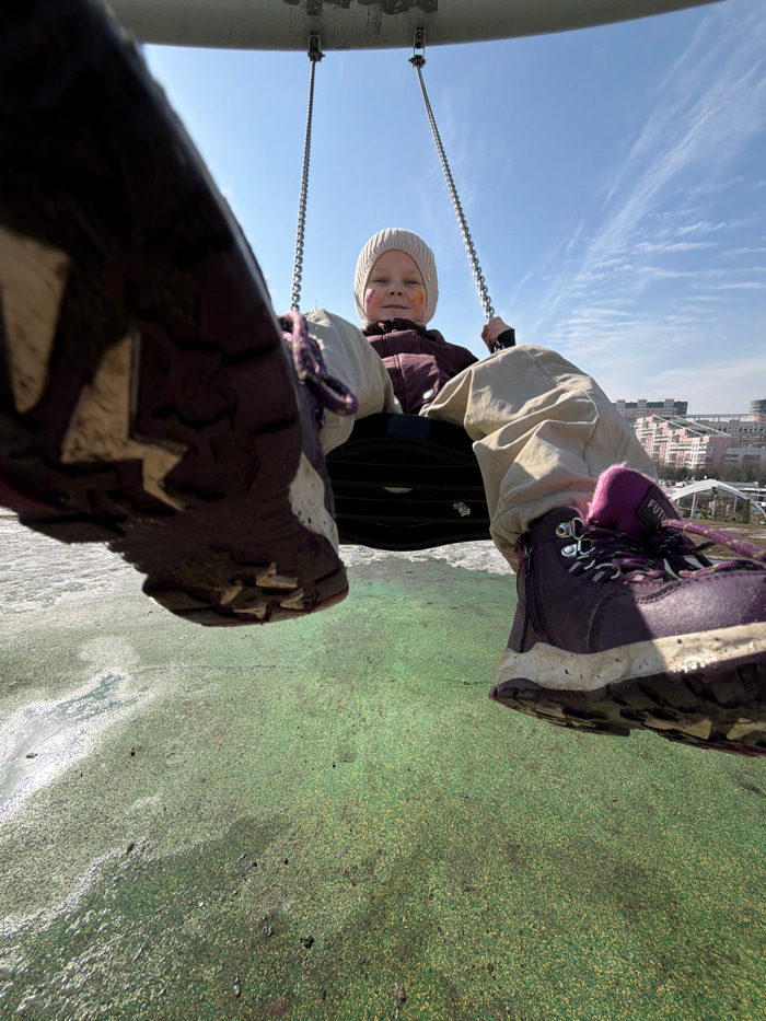 A low-angle photograph captures a child on a swing set within an urban park environment, identified as Khimki Park in Khimki, Russia, under a clear blue sky with minimal cloud cover. The immediate for…read more