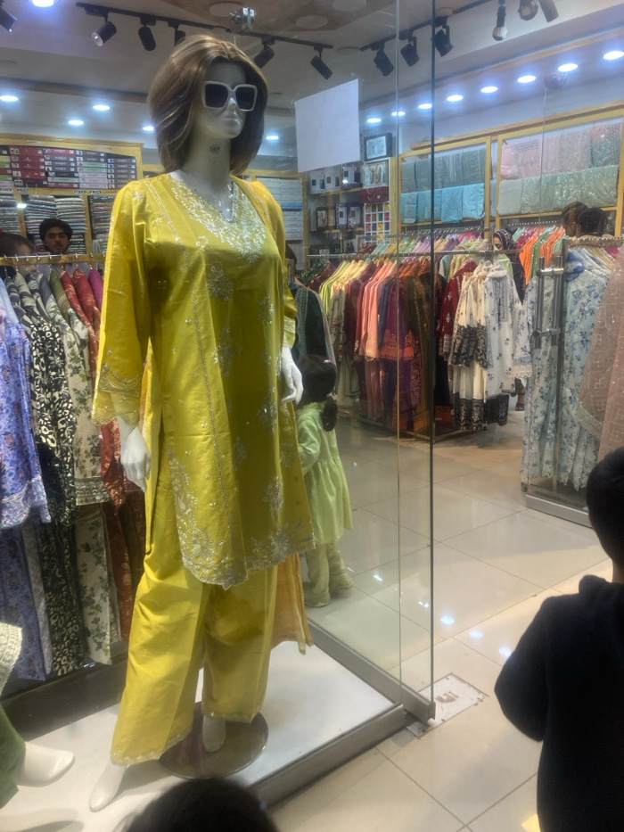 The image depicts the interior of a clothing retail store located in Quetta City Tehsil, Pakistan. In the foreground, a female mannequin stands centrally, dressed in a bright yellow, embroidered long-…read more