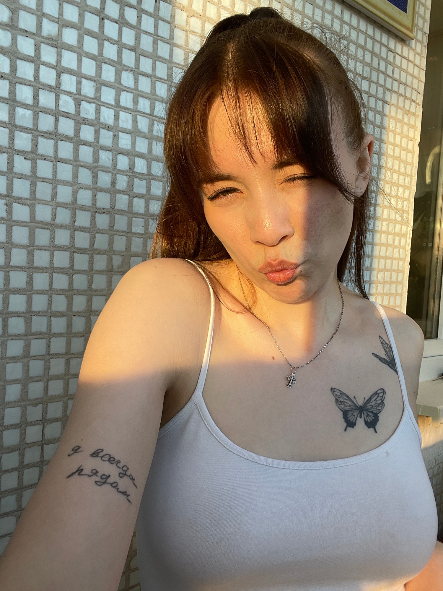 A young woman with brown hair and a white tank top is lying on a white tiled surface. She has tattoos on her chest (butterflies) and forearm (script). A silver necklace with a cross pendant is visible…read more