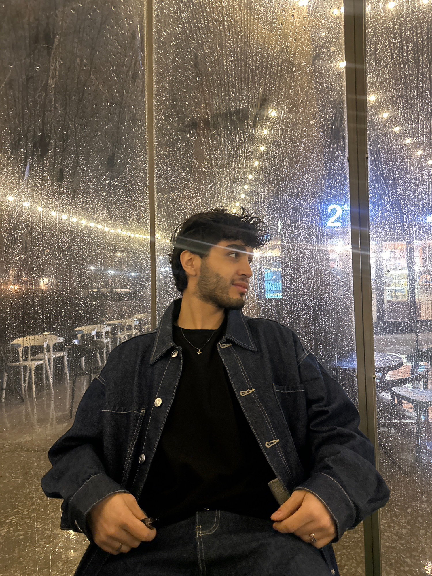 A medium shot of a man with dark hair and a beard, wearing a dark denim jacket over a black shirt, looking upwards and to the left. He's standing in what appears to be a bus stop or a shelter. Behind…read more