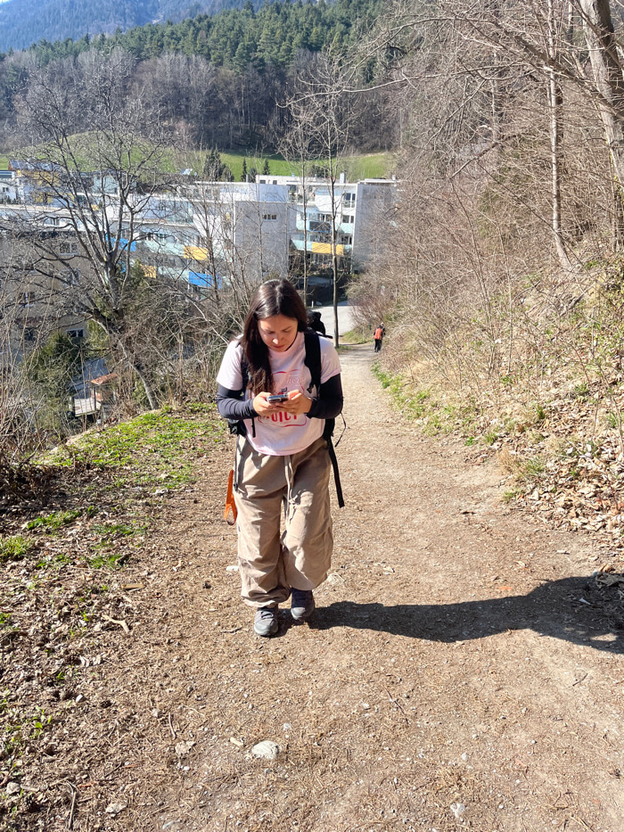 An individual stands on a sunlit dirt path on a hillside overlooking the city of Innsbruck, Austria. The primary subject, a female with long dark hair, is positioned in the foreground, looking down at…read more