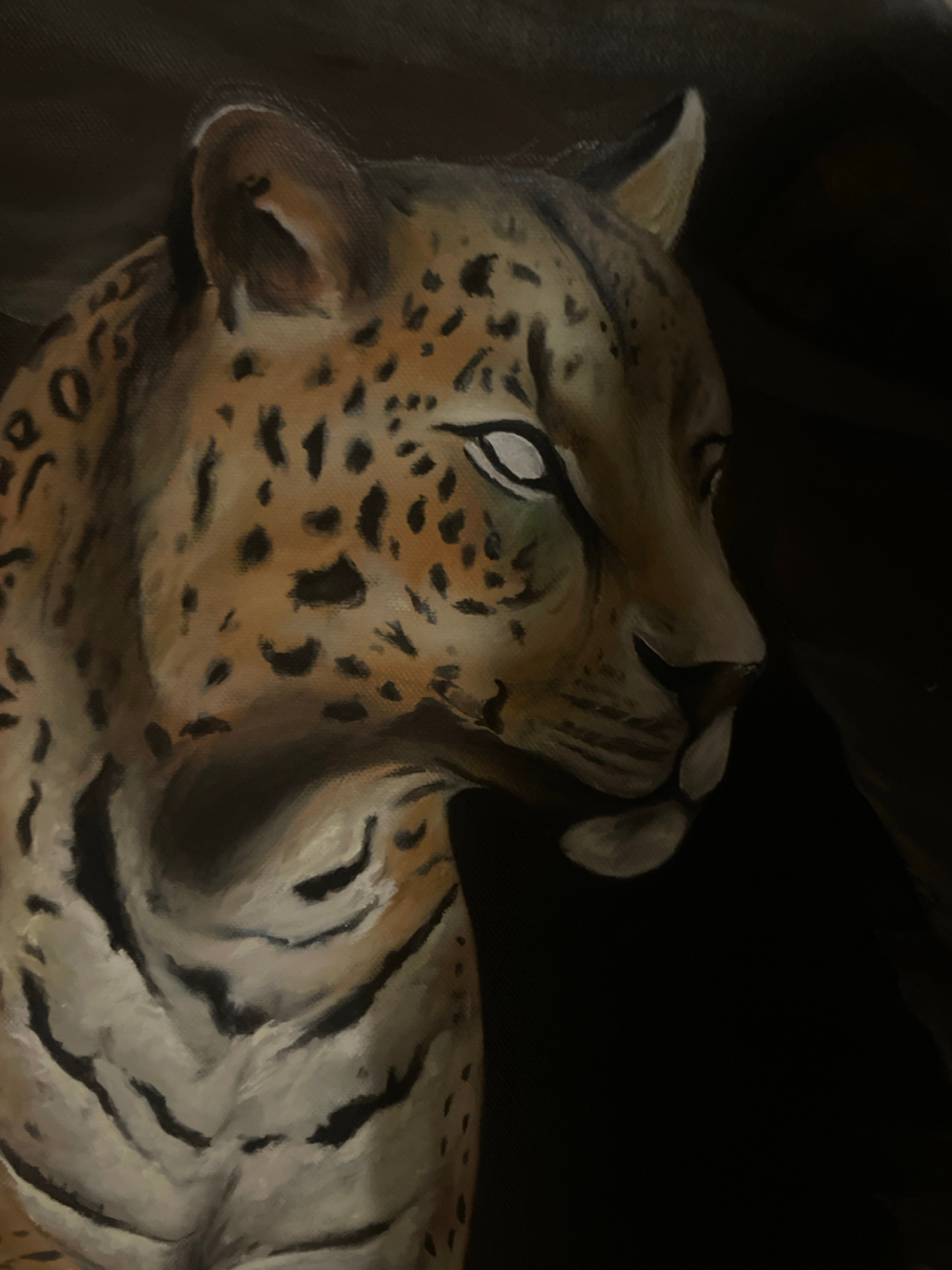 The image is a close-up painting of a leopard or similar spotted feline, possibly a jaguar. The animal is in a reclining position, with its head tilted upwards and to the left. It is primarily lit fro…read more