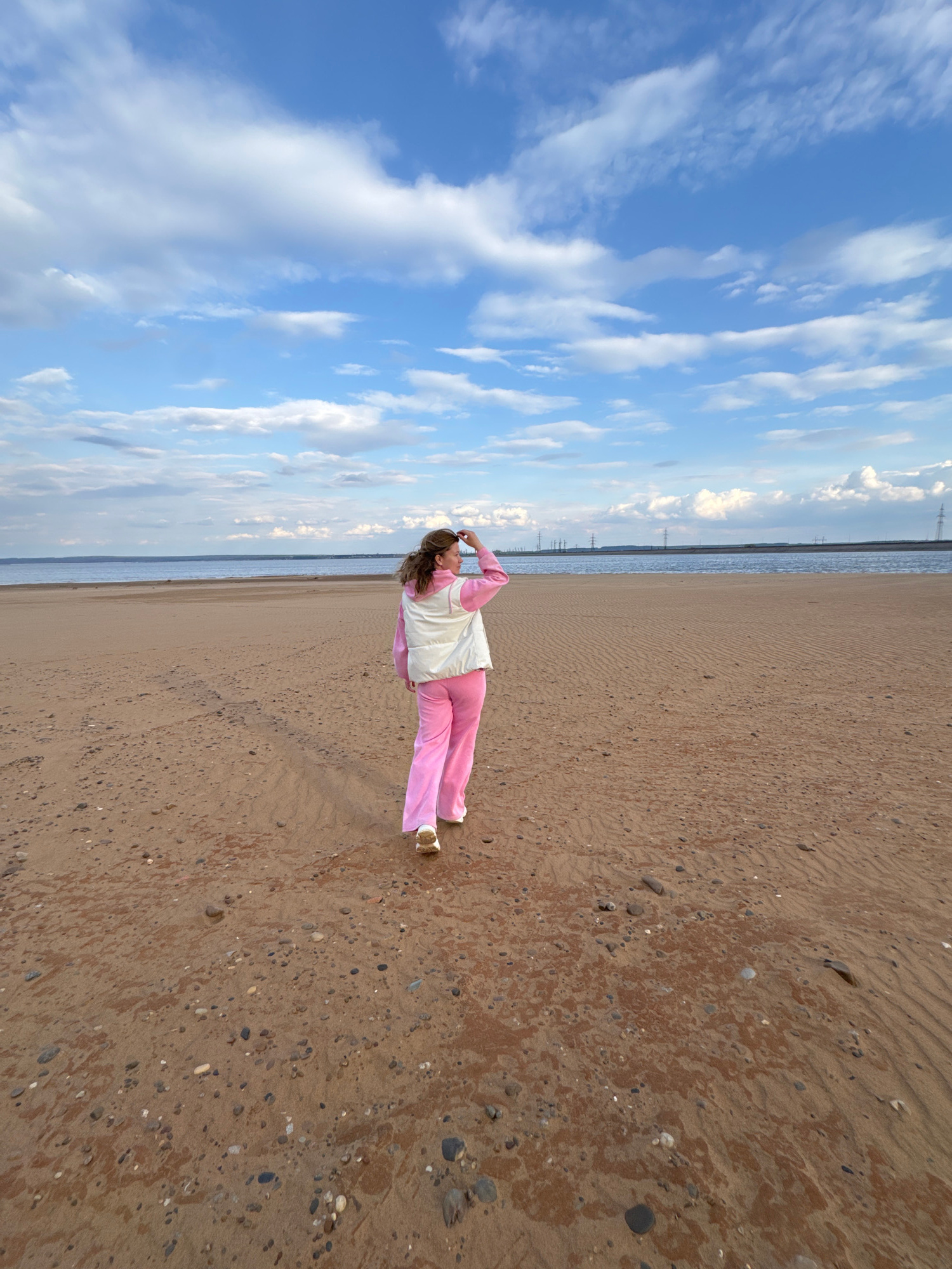 A woman lies on a beach. She is wearing pink sweatpants and a white vest. Her arms are raised above her head. The beach is sandy, and there are small stones scattered throughout. Beyond the beach is t…read more