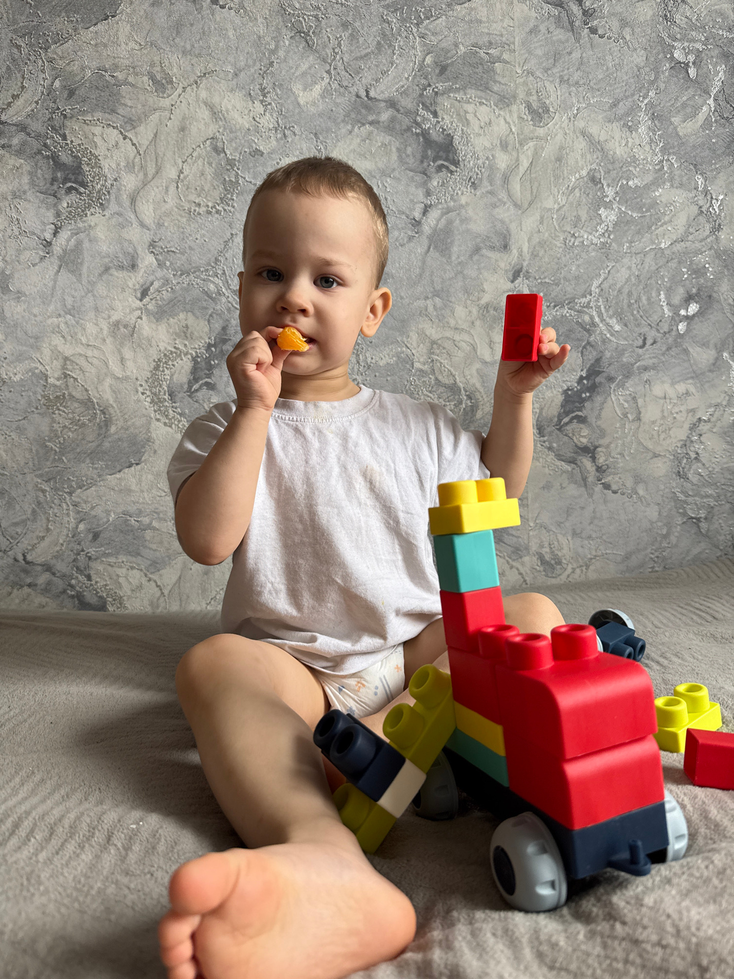 A toddler sits on a light-colored surface, possibly a bed, in a room with a gray textured wall. The child wears a white t-shirt and a diaper. They are eating a segment of an orange with their right ha…read more
