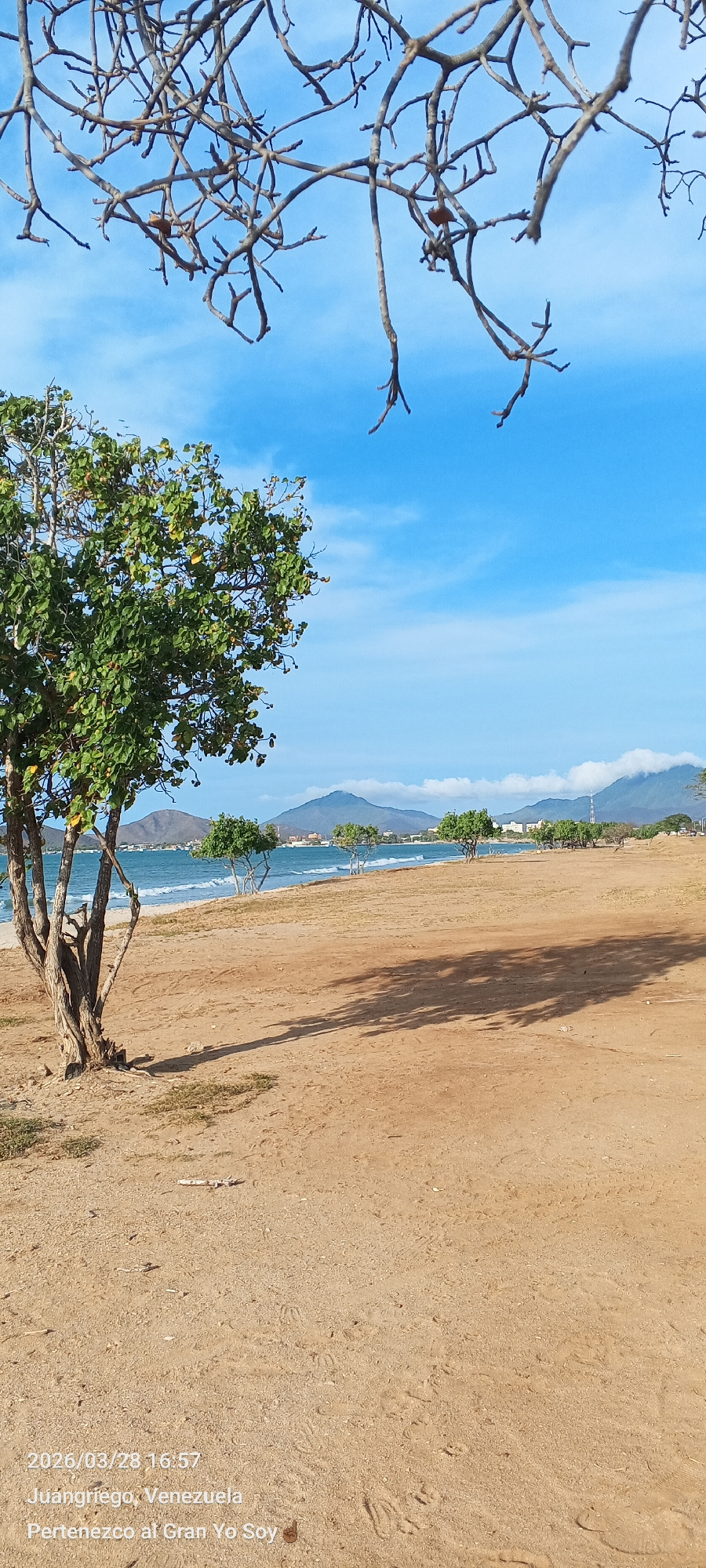 The photograph depicts a beach scene in Juan Griego, Venezuela, on March 28, 2026. The image is captured from a ground-level perspective. The foreground shows a sandy beach with visible footprints. Sh…read more