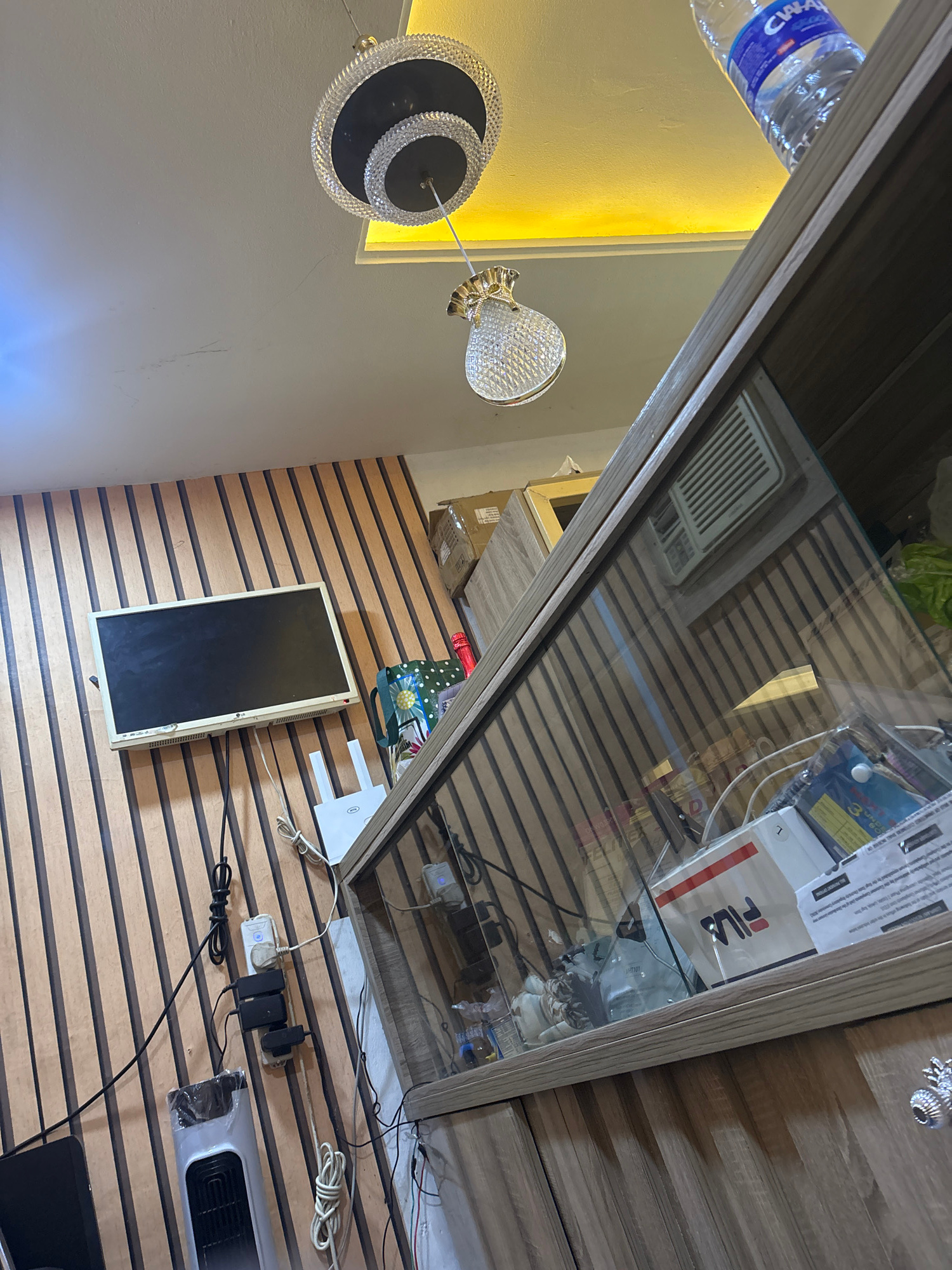 The image shows a room interior. A water bottle is visible near a ceiling light fixture. A glass-fronted display cabinet sits near a wall with horizontal wooden slats. Underneath the cabinet, there's…read more