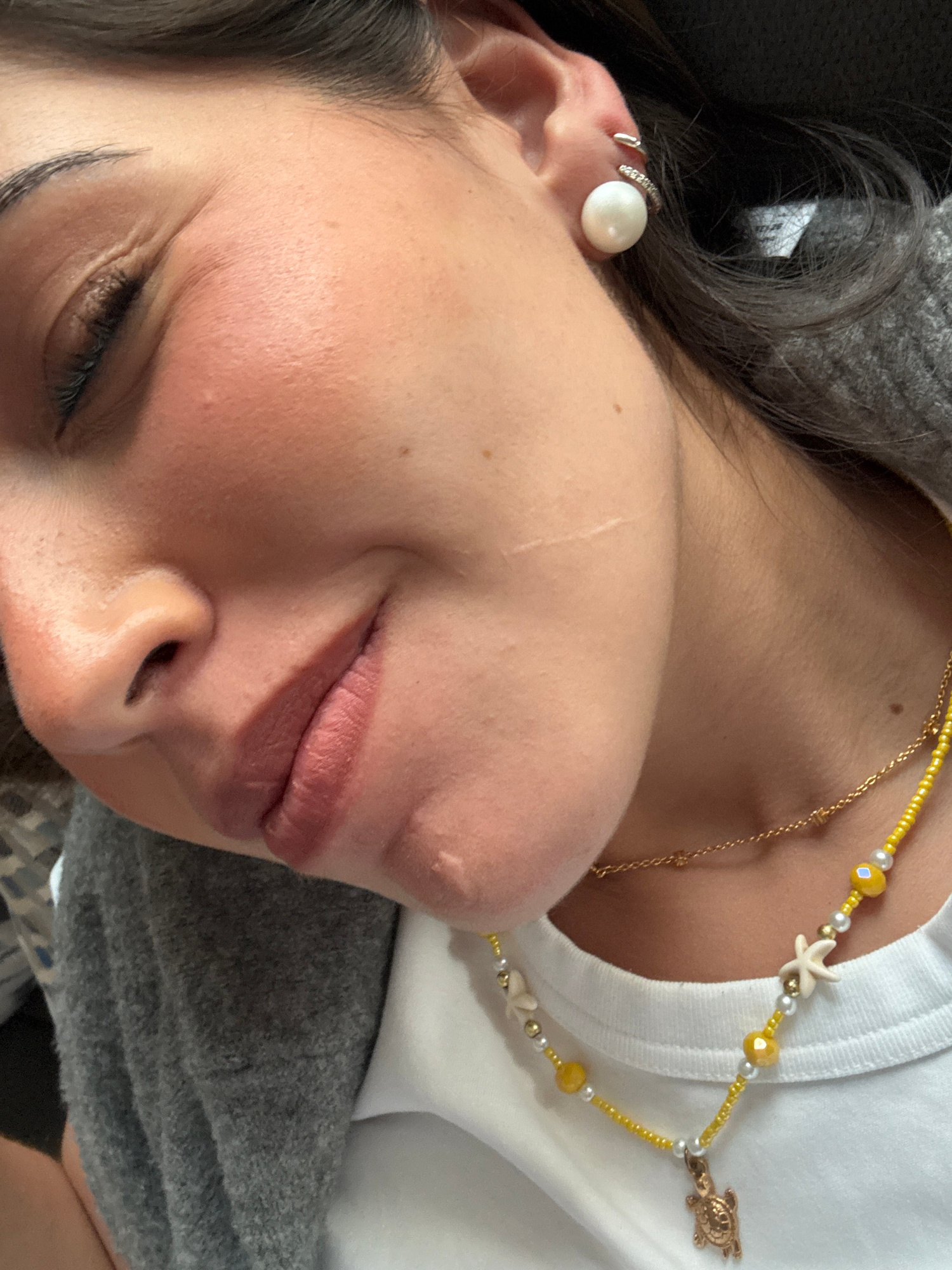 A close-up, angled head-and-shoulders shot of a person with light skin, closed eyes, and dark hair. The person is wearing a white t-shirt and a gray sweater. The person has a pearl earring and a beade…read more
