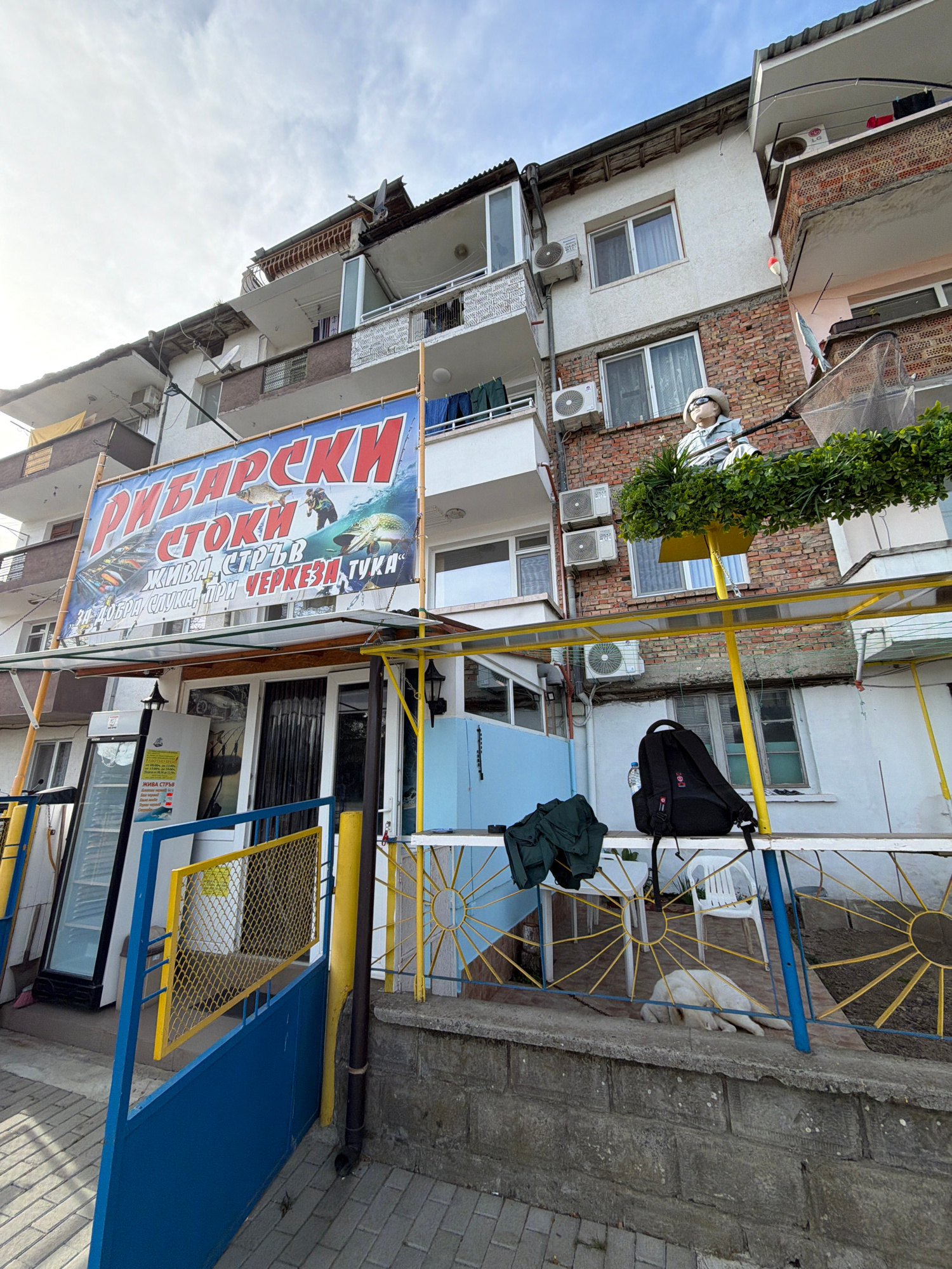 The image presents a tilted view of a street scene in Tsarevo, Bulgaria, featuring the facades of several buildings under a bright, partially cloudy sky. The architecture consists of multi-story build…read more