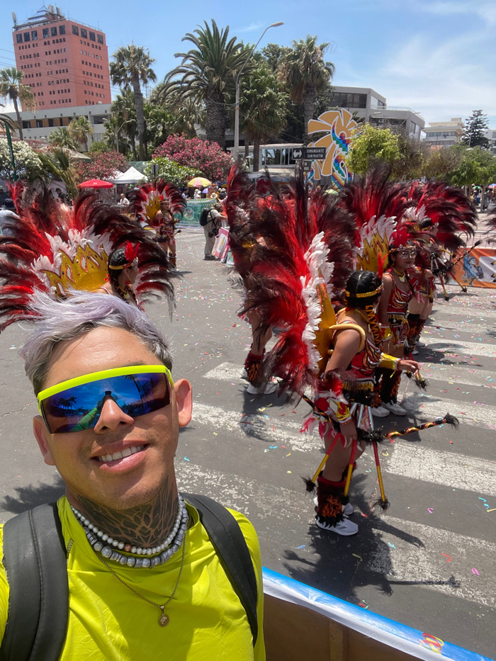 A man with light skin, sporting neon-framed sunglasses and layered beaded necklaces, smiles in the foreground. Behind him, a street parade unfolds. Participants don elaborate feathered headdresses in…read more