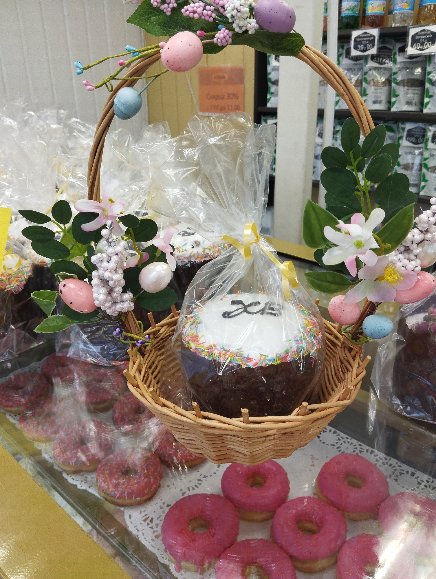 The image shows a retail display in Votkinsk, Russia, featuring baked goods for sale. A wicker basket, decorated with artificial flowers and pastel-colored eggs, holds packaged Easter cakes. The cakes…read more