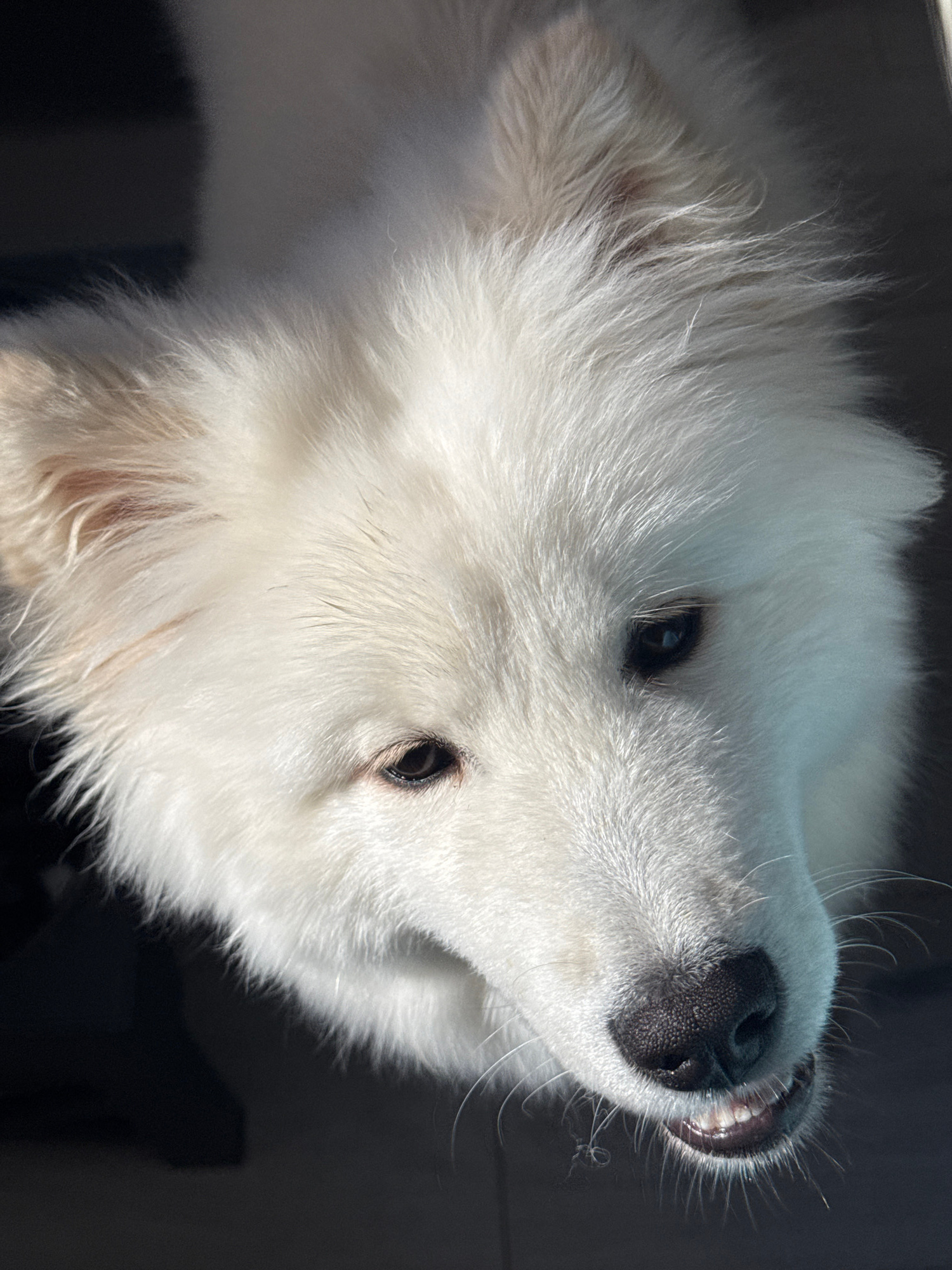 This close-up portrait captures the head and upper body of a white, fluffy dog, likely a Samoyed, in Chaikovsky, Russia. The dog is positioned with its head tilted upwards and slightly to its right, i…read more