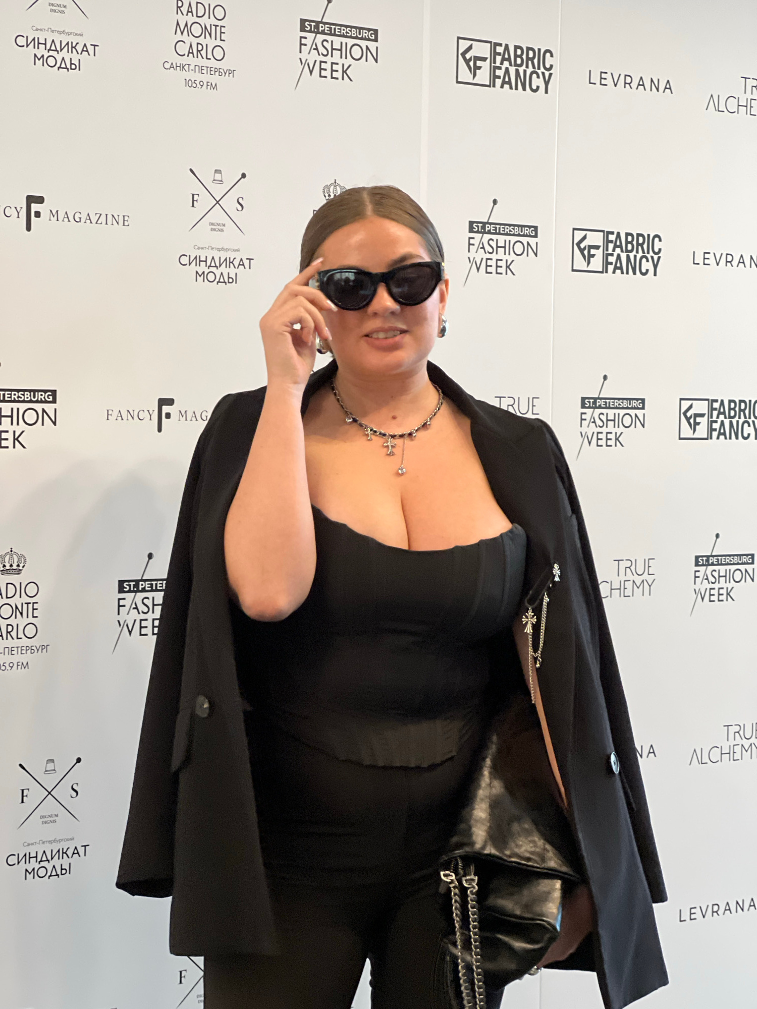 The image presents a woman wearing a black outfit, including sunglasses and a necklace with cross pendants, standing in front of a backdrop. The backdrop features branding and logos, including "ST. PE…read more