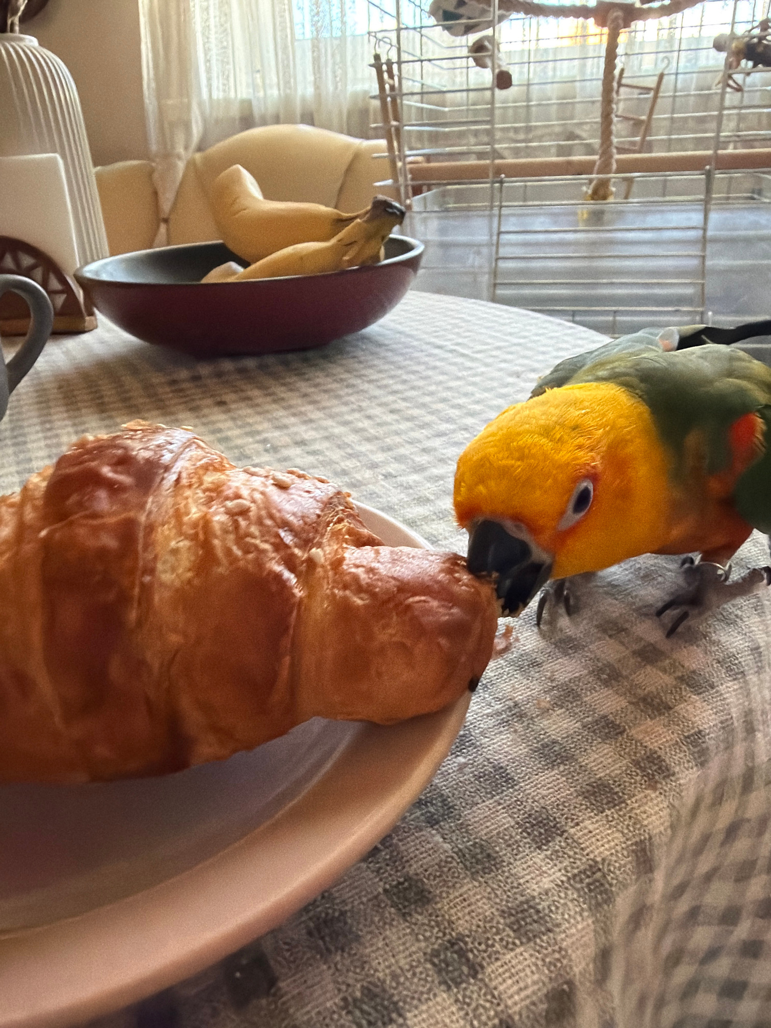 The image shows a green and yellow parrot perched on the edge of a light pink plate, eating a croissant. Next to the plate is a red bowl containing bananas. In the background, there's a birdcage. The…read more