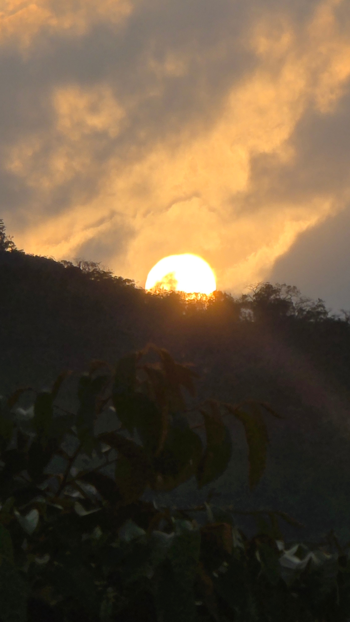 The photograph depicts a sunset scene at the Bac Natural Heritage Area Trang, Vietnam. The sun is positioned low in the sky, partially obscured by a dark, mountainous or hilly terrain. The sky display…read more