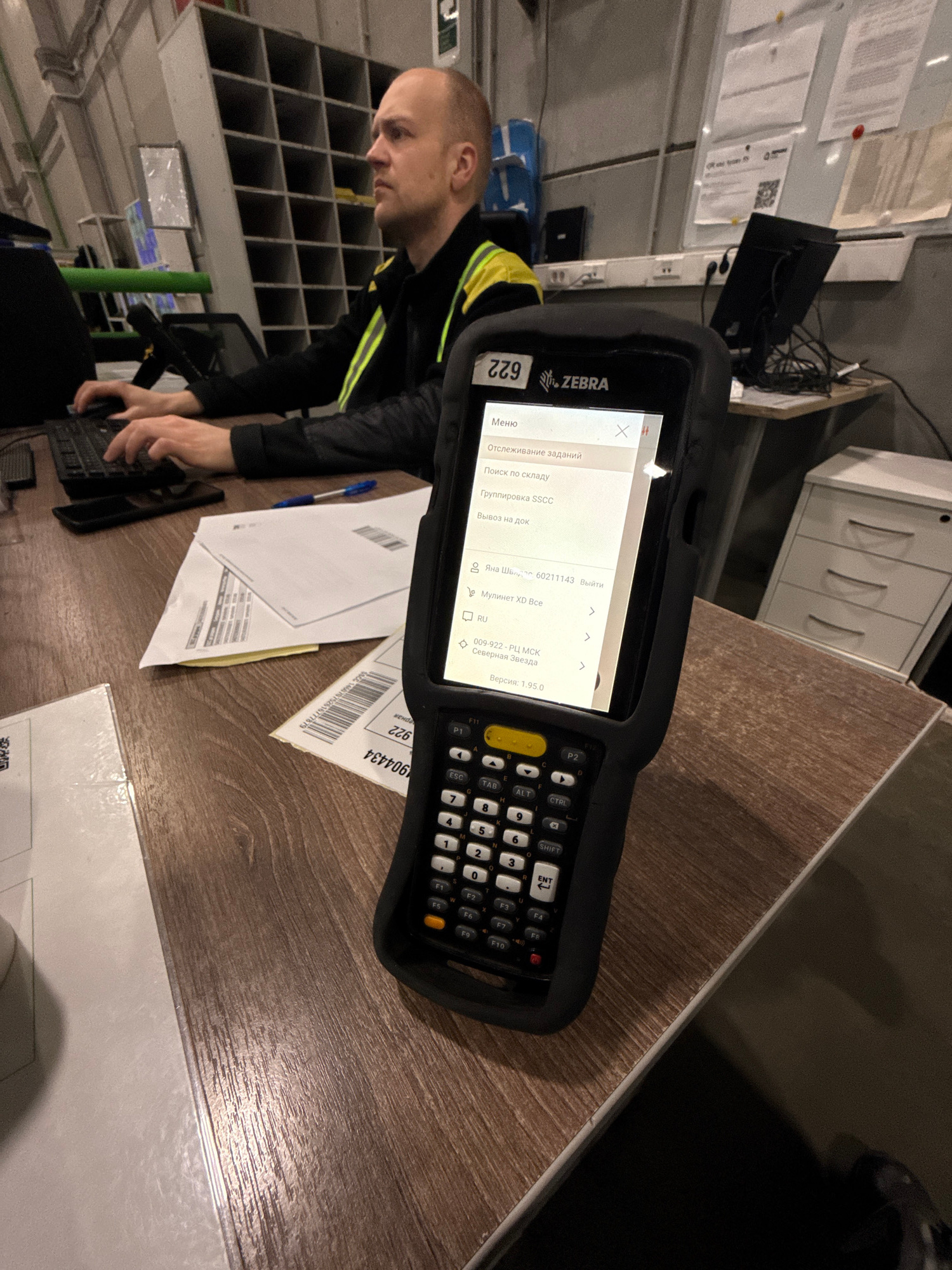 The image shows a man in Lupanovo, Russia, working at a desk. He is wearing a black jacket with yellow stripes. He is interacting with a Zebra mobile computer with a QWERTY keyboard and a screen displ…read more