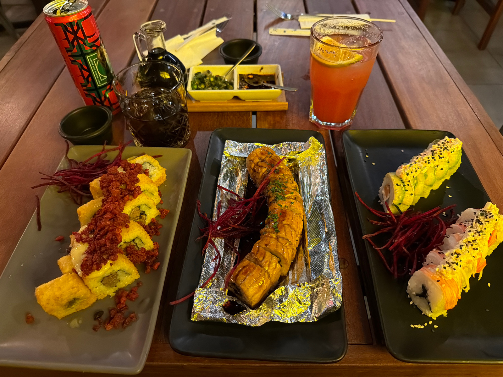 The image shows a table laden with various dishes, likely in a restaurant setting, in Unknown, Unknown. There are three plates of sushi: the left plate presents fried sushi topped with reddish-brown c…read more