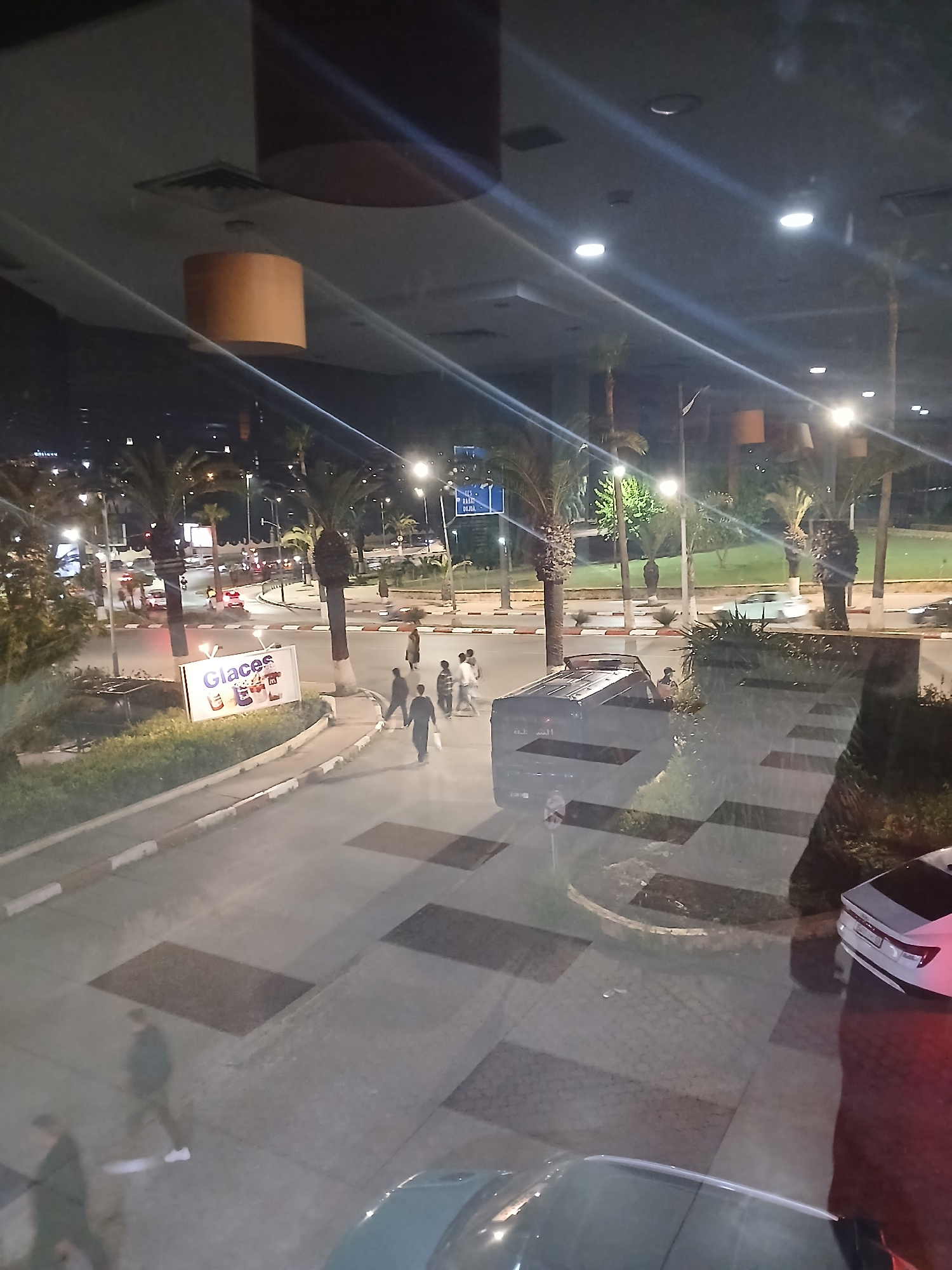 The image shows an outdoor scene in Meknes, Morocco, at night. Palm trees line a street with streetlights illuminating the area. Several people are walking along a sidewalk. Cars are visible on the ro…read more