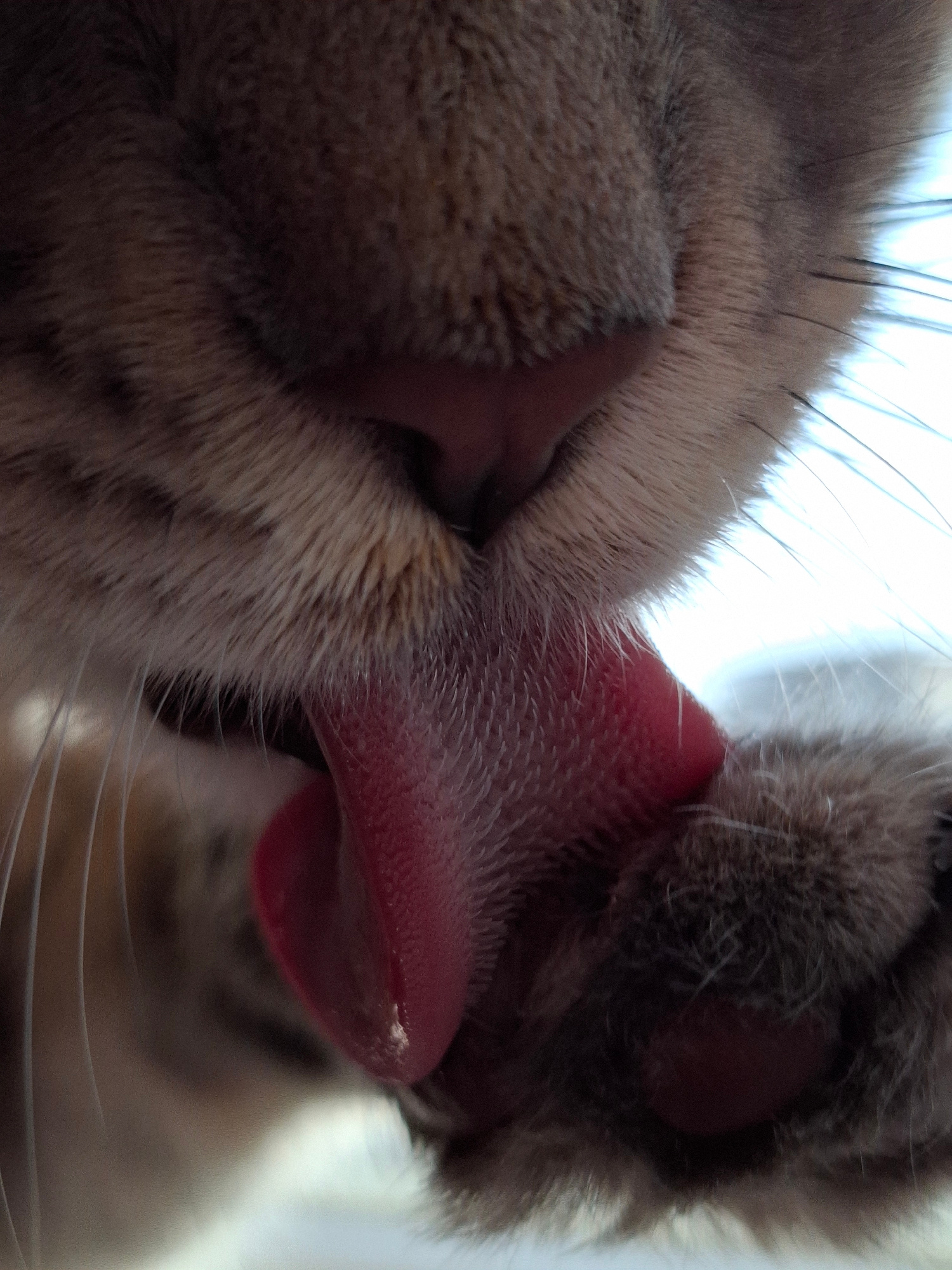 A close-up shows a cat licking its paw. The cat has gray and brown fur. Its tongue is pink and textured. The paw being licked is also gray and brown. The background is blurry and light. There is no ev…read more