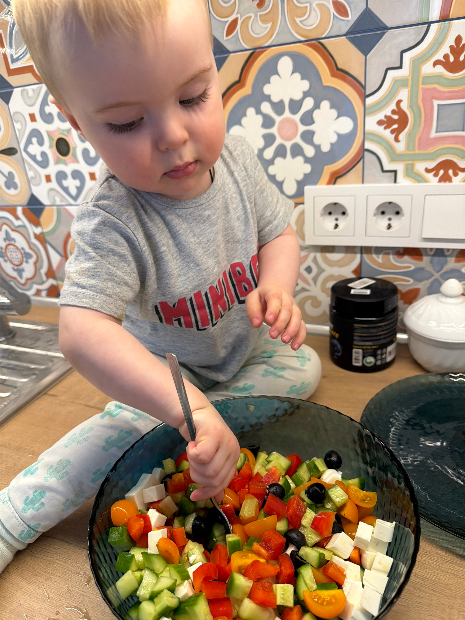 A top-down, close-up shot shows a child with blond hair and fair skin, wearing a grey t-shirt with a red and black logo. The child is holding a metal spoon in their right hand, reaching into a blue-ti…read more