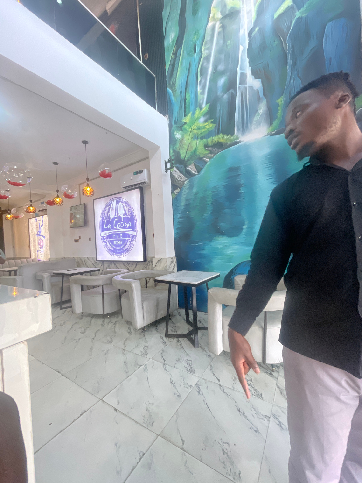 The image shows the interior of a restaurant named "La Cocina - The Kitchen," located in Ado, Nigeria. The restaurant features a modern design with white marble floors, white chairs, and pendant light…read more