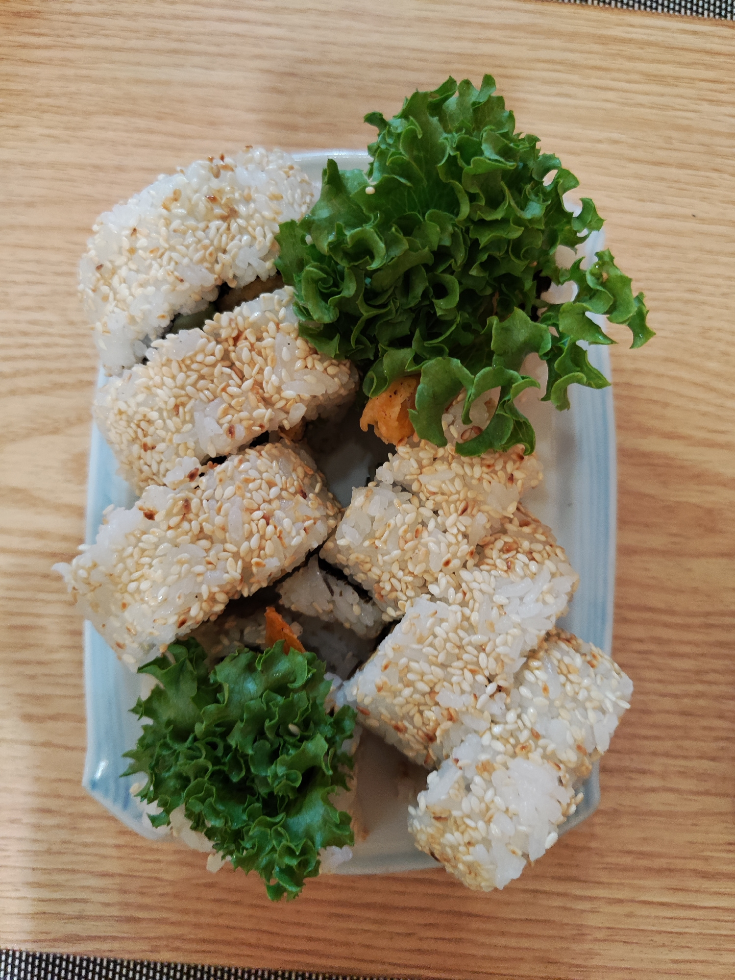 A top-down shot captures a rectangular ceramic plate with a light blue border, holding sesame-covered sushi rolls and green lettuce. The sushi pieces are arranged somewhat haphazardly, and the lettuce…read more