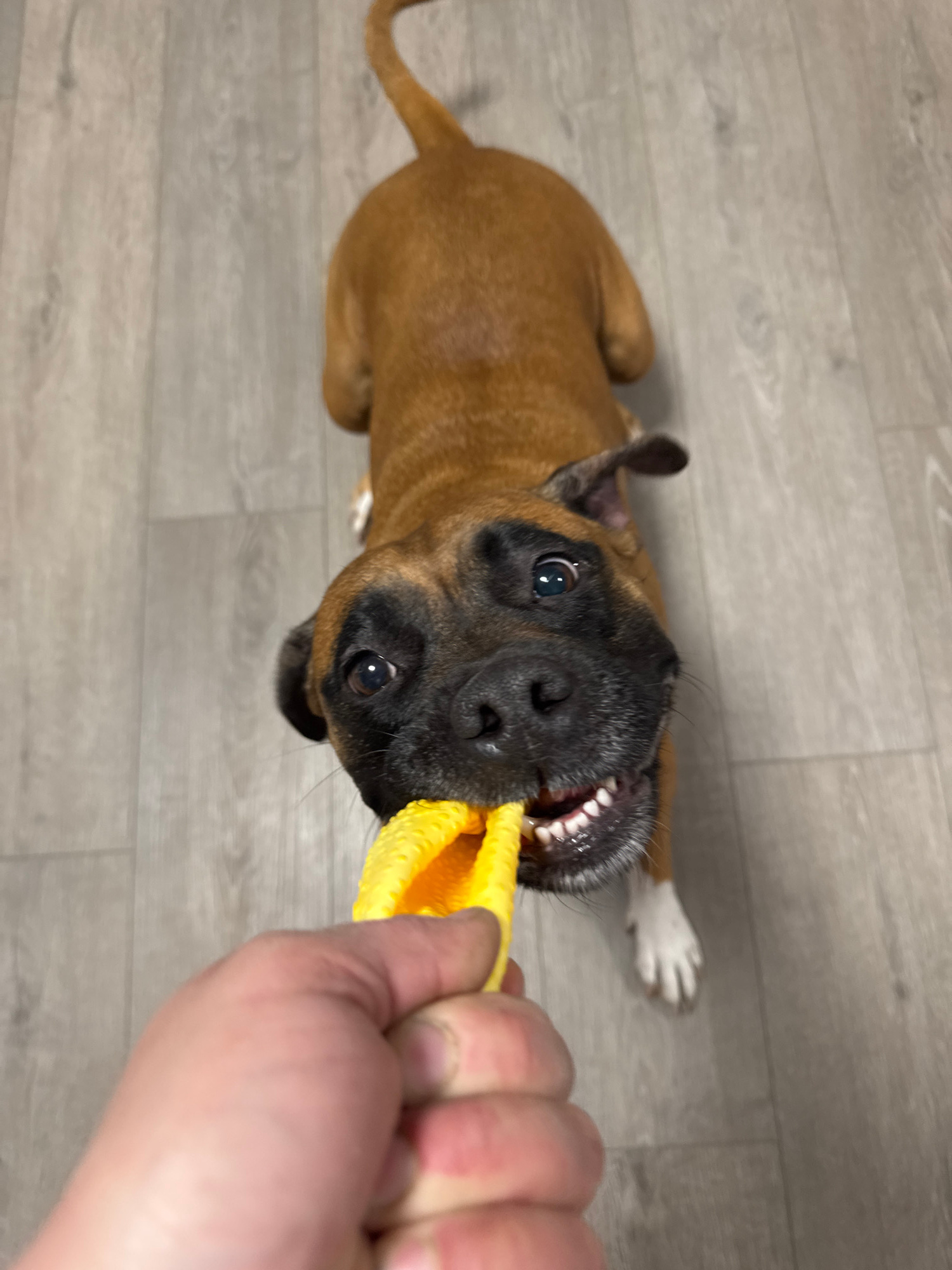 A brown boxer puppy is lying on a grey wood floor, facing upward and pulling on a yellow object held by a person’s hand. The puppy has a black muzzle and its teeth are visible. One of its paws is whit…read more