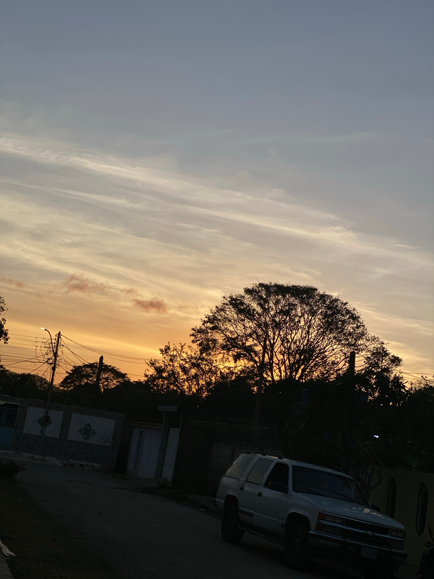At twilight in Juan Griego, Venezuela, a light-colored SUV is parked along a street next to a stone wall and behind a tree with dense, dark branches silhouetted against the yellow and grey sky. Overhe…read more