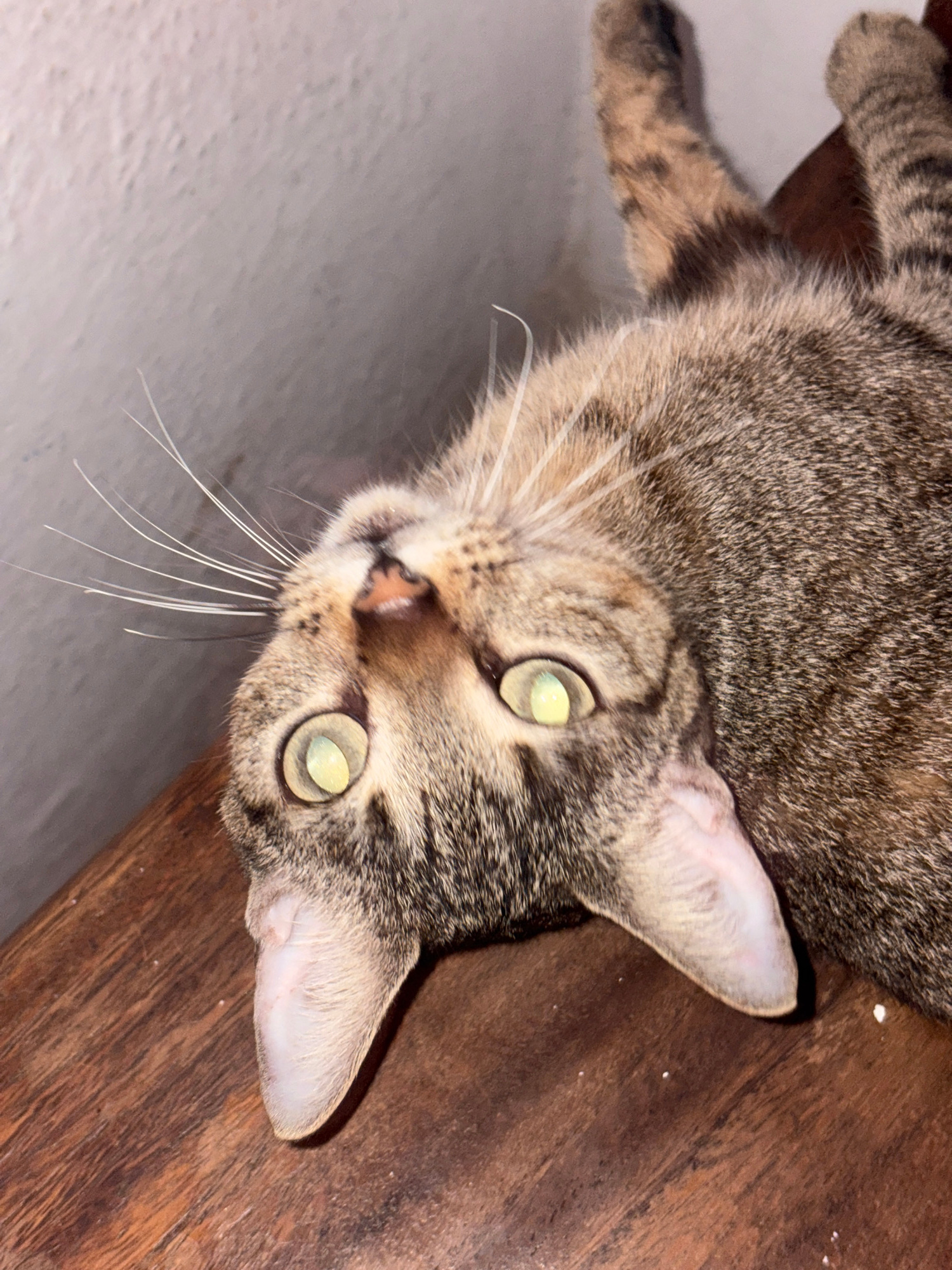 The image shows a close-up of a tabby cat lying down. The cat is mostly brown and gray with darker stripes. It has pale yellow-green eyes and white whiskers. The cat is lying on a wooden surface with…read more