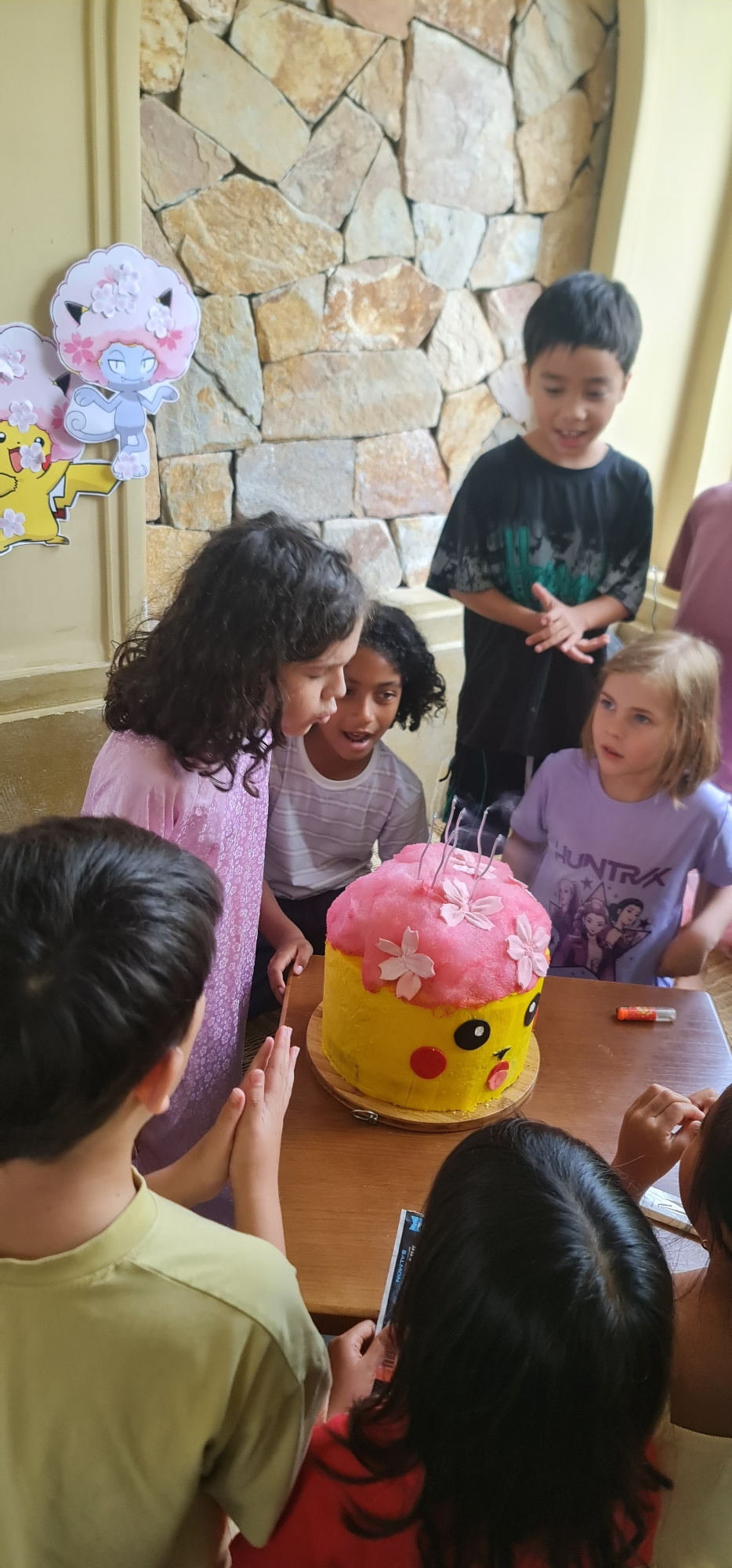 A group of children are gathered around a table with a Pikachu-themed cake, which is half yellow and half pink with flower decorations. The children are of various ethnicities and are wearing casual c…read more