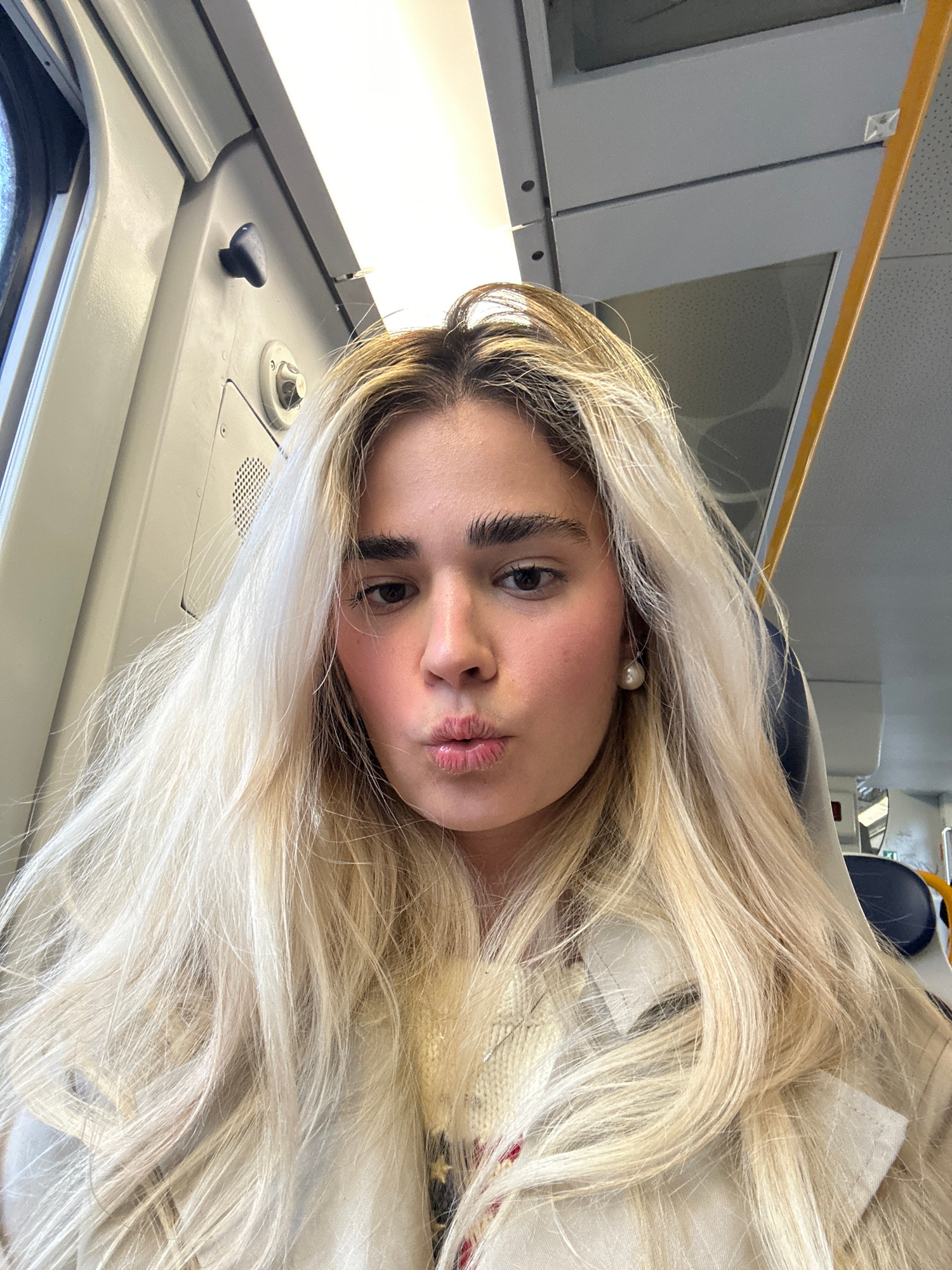 A selfie-style photograph shows a woman with blonde hair, light skin, and dark eyebrows. She is pouting her lips slightly, and is wearing a pearl earring. She appears to be inside a train carriage, ba…read more