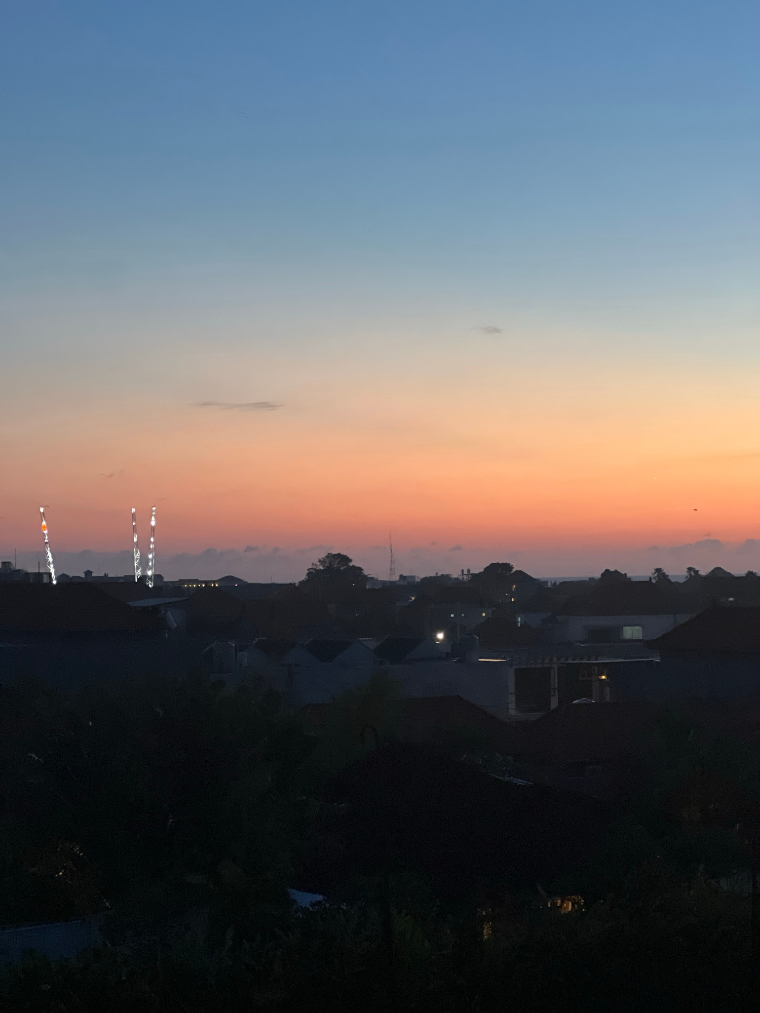 The image shows a sunset view over what appears to be a residential area. The sky transitions from blue to orange. The silhouettes of buildings and trees are visible against the colorful sky. In the lā¦read more