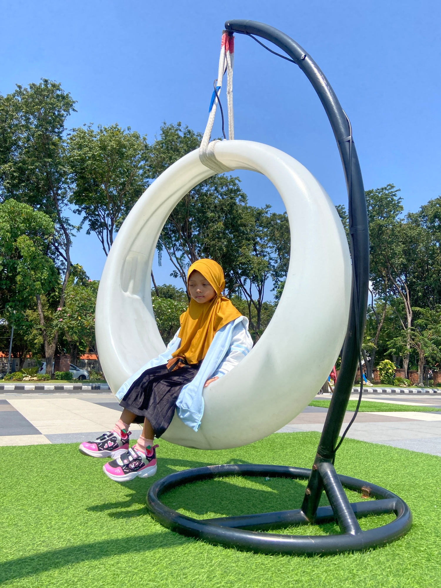 A child wearing a yellow hijab and a gold-colored top, along with black pants and pink and black shoes, is sitting in a large, white, circular swing. The swing is suspended from a black metal frame lo…read more