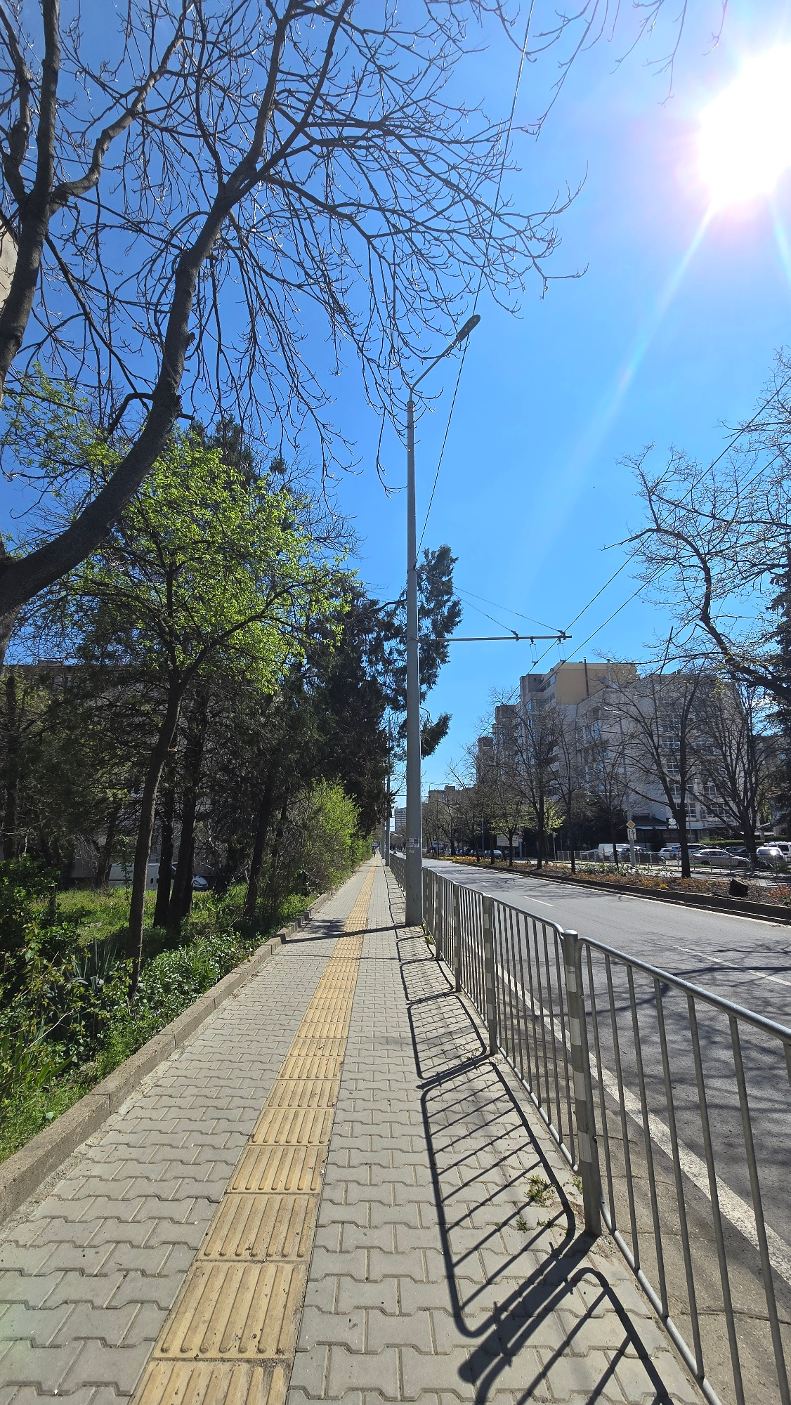 The image shows a pedestrian sidewalk in Stara Zagora, Bulgaria, flanked by a metal fence on one side and greenery on the other. A yellow tactile paving strip runs along the edge of the sidewalk. The…read more