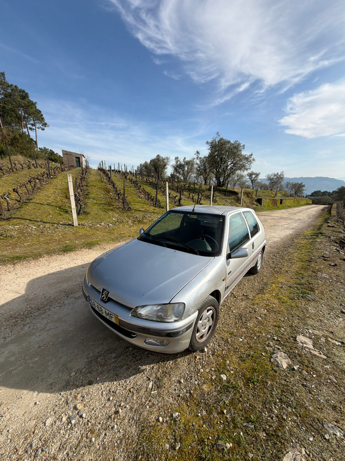 A silver Peugeot 106 is parked on a dirt road next to a vineyard. The car faces the camera, with the license plate partially visible. The vineyard has rows of grapevines and some trees in the backgrou…read more