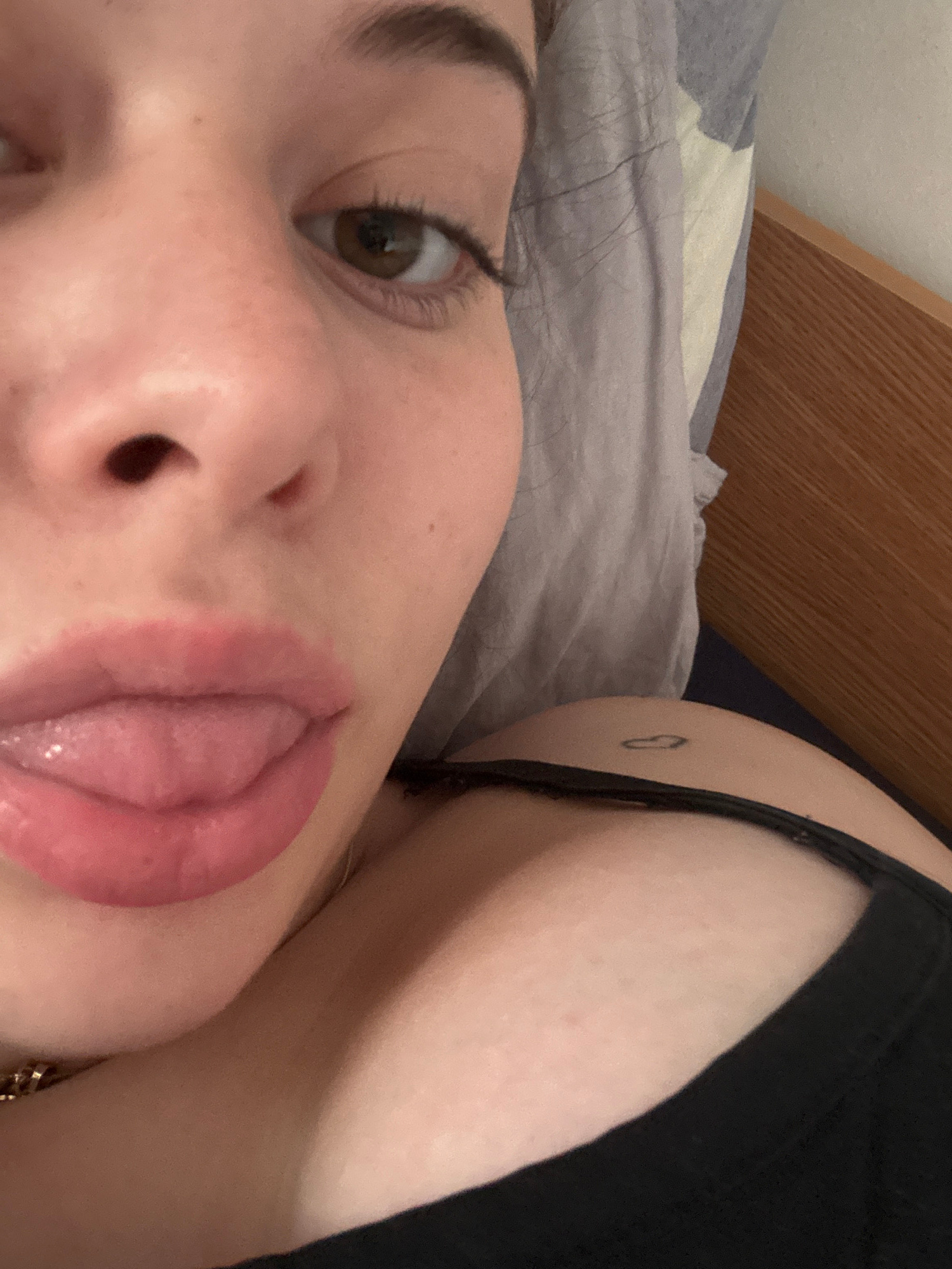 A close-up, angled selfie depicts a fair-skinned person with light brown eyes and dark eyebrows lying on what appears to be a bed with a light gray patterned sheet and a wooden headboard. The person's…read more