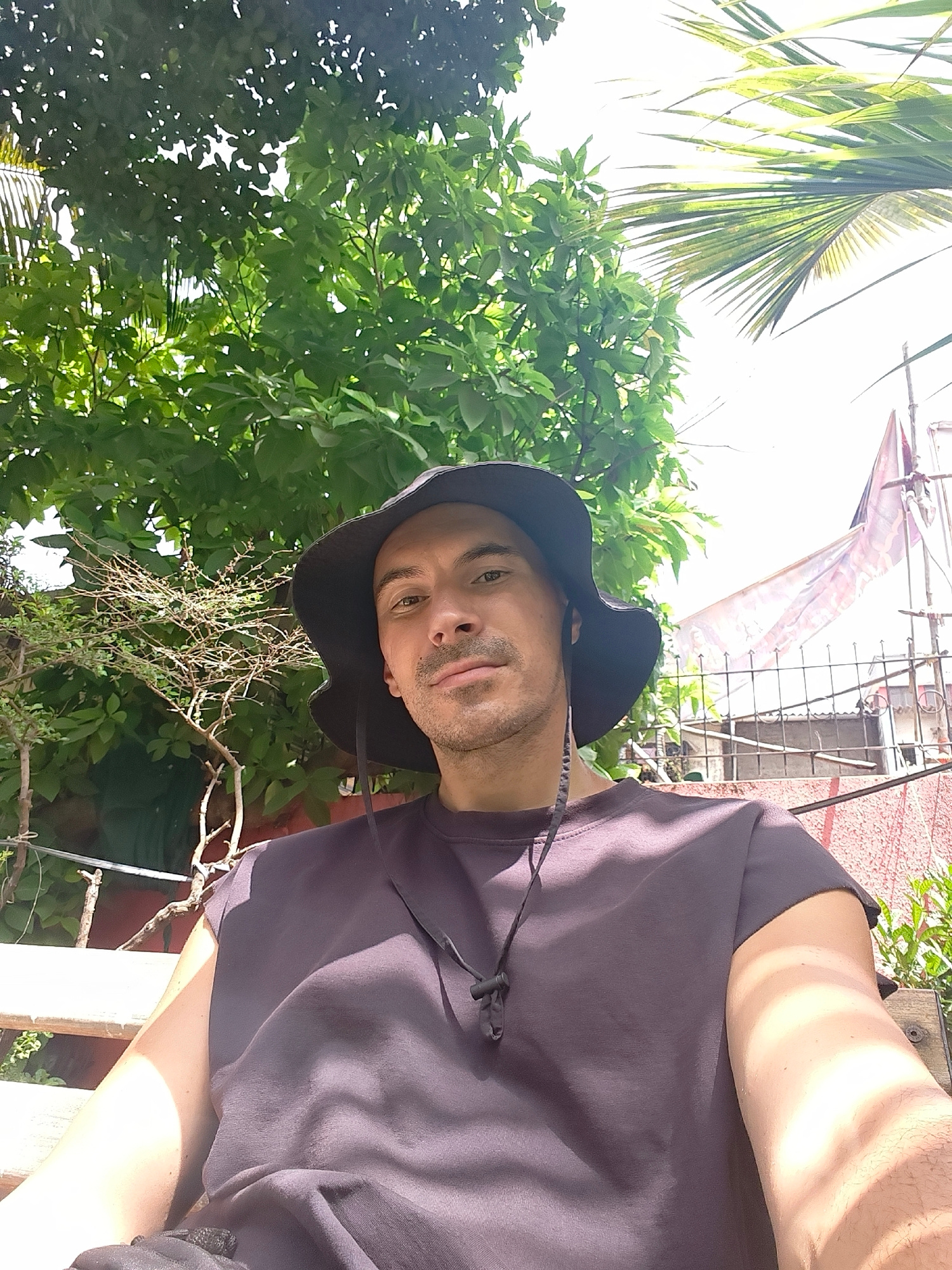 The image shows a man wearing a black hat and a dark purple sleeveless shirt, sitting outside. Behind him is a lush green tree and a palm frond, suggesting a tropical or subtropical environment. In th…read more