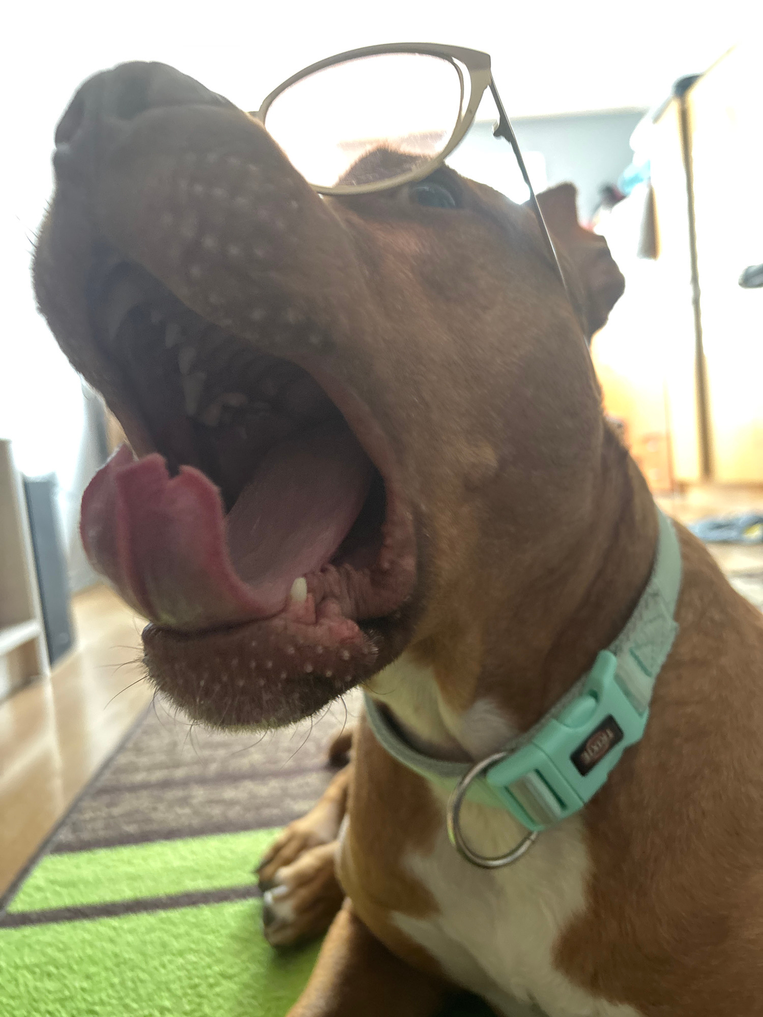 An upward-facing, rotated, close-up shot features a brown and white dog in an indoor setting. The dog, likely lying down, has its head tilted back and its mouth wide open, revealing white teeth and a…read more