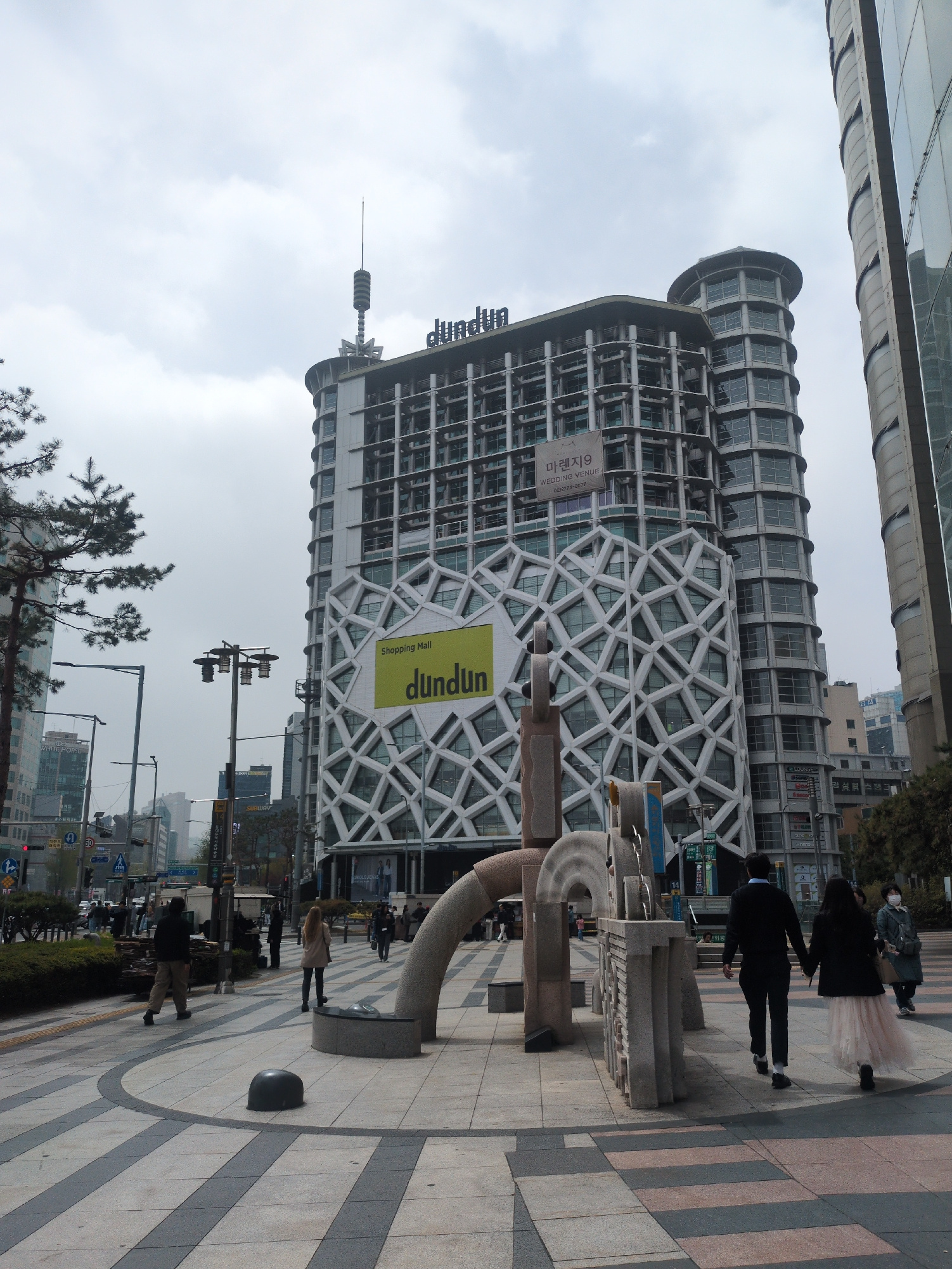 The image shows a street scene in Seoul, South Korea. A distinctive building with a patterned exterior and a 'dundun' sign is visible. Pedestrians are walking along a paved sidewalk with a patterned d…read more
